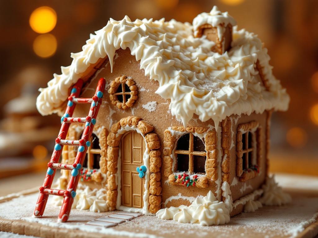 Démouler la brique et déposer dessus le toit en boudoirs. Coller les portes et les fenêtres sur les côtés. Saupoudrer le toit de sucre glace. Ajouter le reste de chantilly nature au sommet du toit. Décorer avec des perles de sucre et placer l’échelle sur 1 côté de la maison. Couper en parts puis déguster.