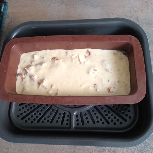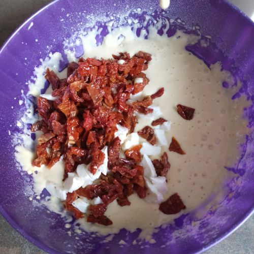 Mélanger 150 g de farine + 1/2 sachet de levure chimique + 10 cl d'huile du bocal de tomates séchées + 10 cl de lait demi-écrémé + 3 oeufs + sel poivre et un peu d'origan.