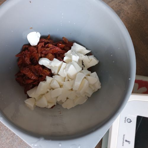 Couper en petites morceaux 150 g de tomates séchées (gardez l'huile du bocal) et la mozzarella.