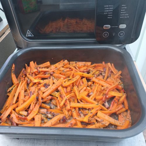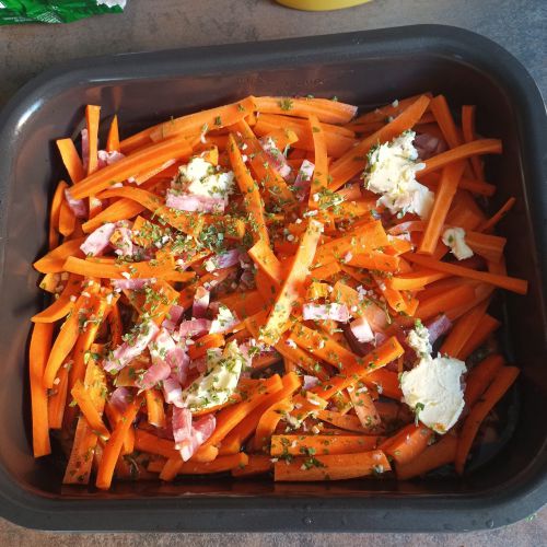 Découper de fins bâtonnets de carottes ; Saler poivrer et persillade ; ajouter 75 g de lardons + une cuillère à soupe de miel ainsi que du beurre doux. Ajouter 20 cl d'eau froide.