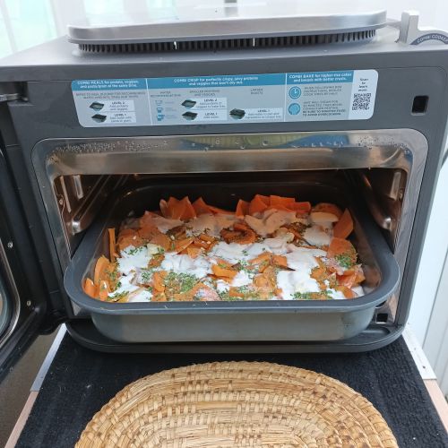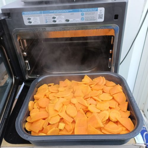 Emincer 1 kg de patates douces et les cuire en mode STEAM durant 10 minutes avec 30 cl d'eau chaude dans le plat combi avec la grille .