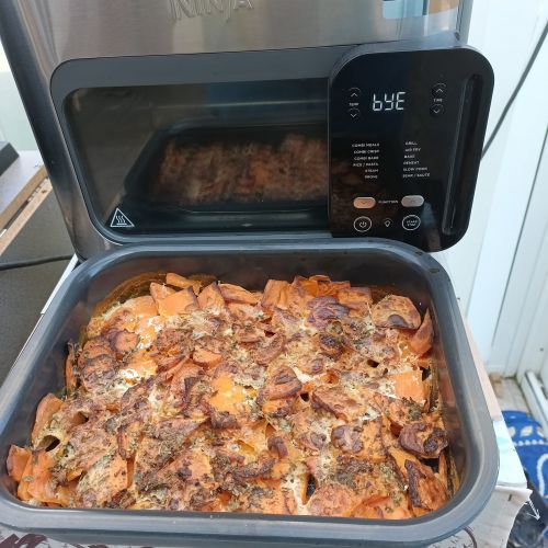 Transvaser les patates douces dans le plat combi sans la grille ; ajouter du sel, du poivre, de la persillade, des noisettes de beurre et 20 cl de crème liquide.
