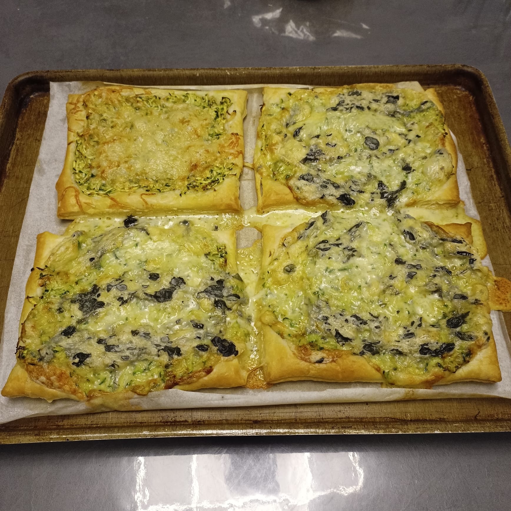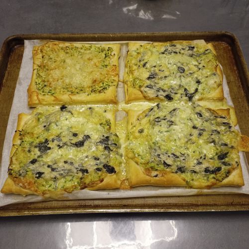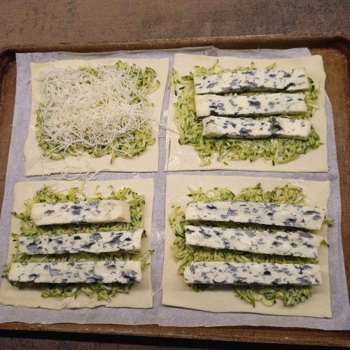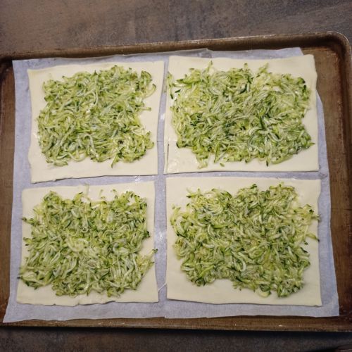 Retirer l'excès de liquide ..... répartir la courgette râpée sur les 4 parts de pâte feuilletée.