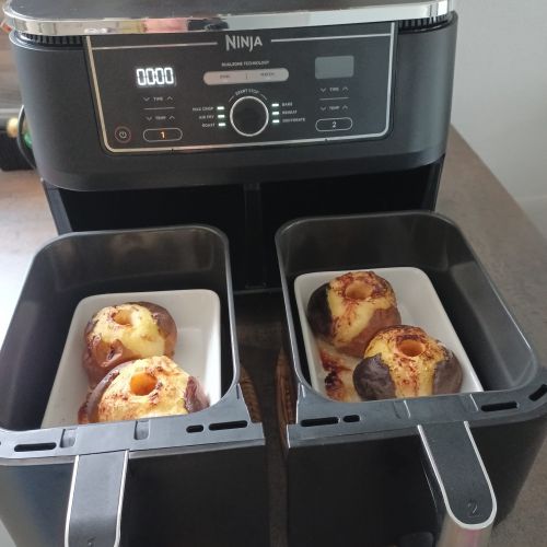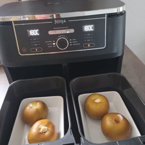 Déposez les pommes dans les moules après les avoir lavées et retirer les trognons. Ajouter le beurre et le sucre Air Fryer à 180° durant 20 minutes.