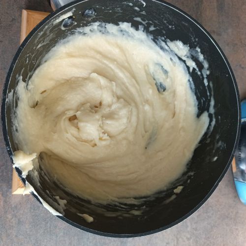 Arrêter la cuisson, ajouter 125 g de farine et lorsqu'elle est bien incorporée, ajouter 1 oeuf.