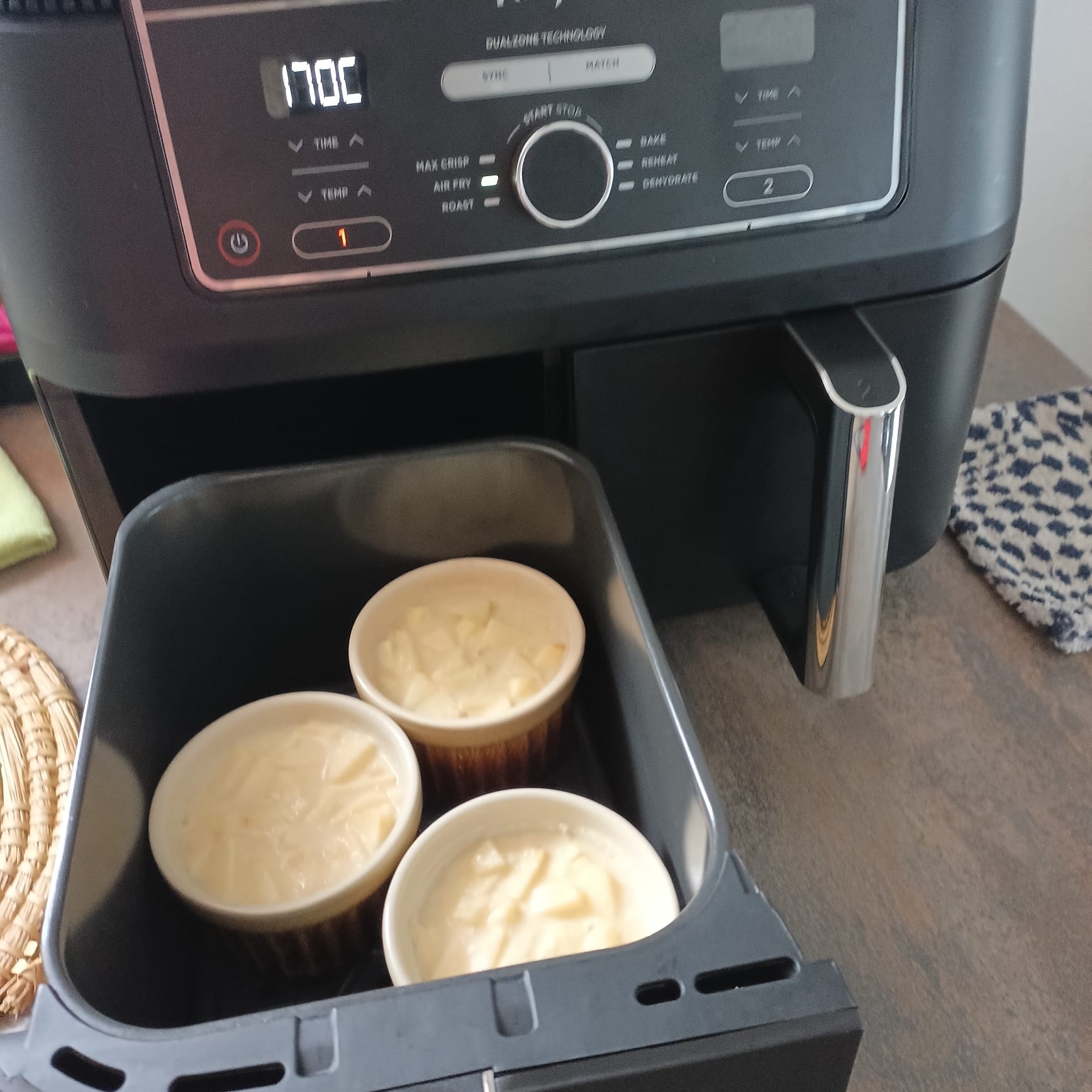 Mélanger 1 oeuf + 40 g de sucre + 60 g de farine + 30 g de beurre fondu + 15 cl de lait demi-écrémé + 2 cuillères à café de vanille liquide. Ajouter 1 pomme coupée en petits dés.