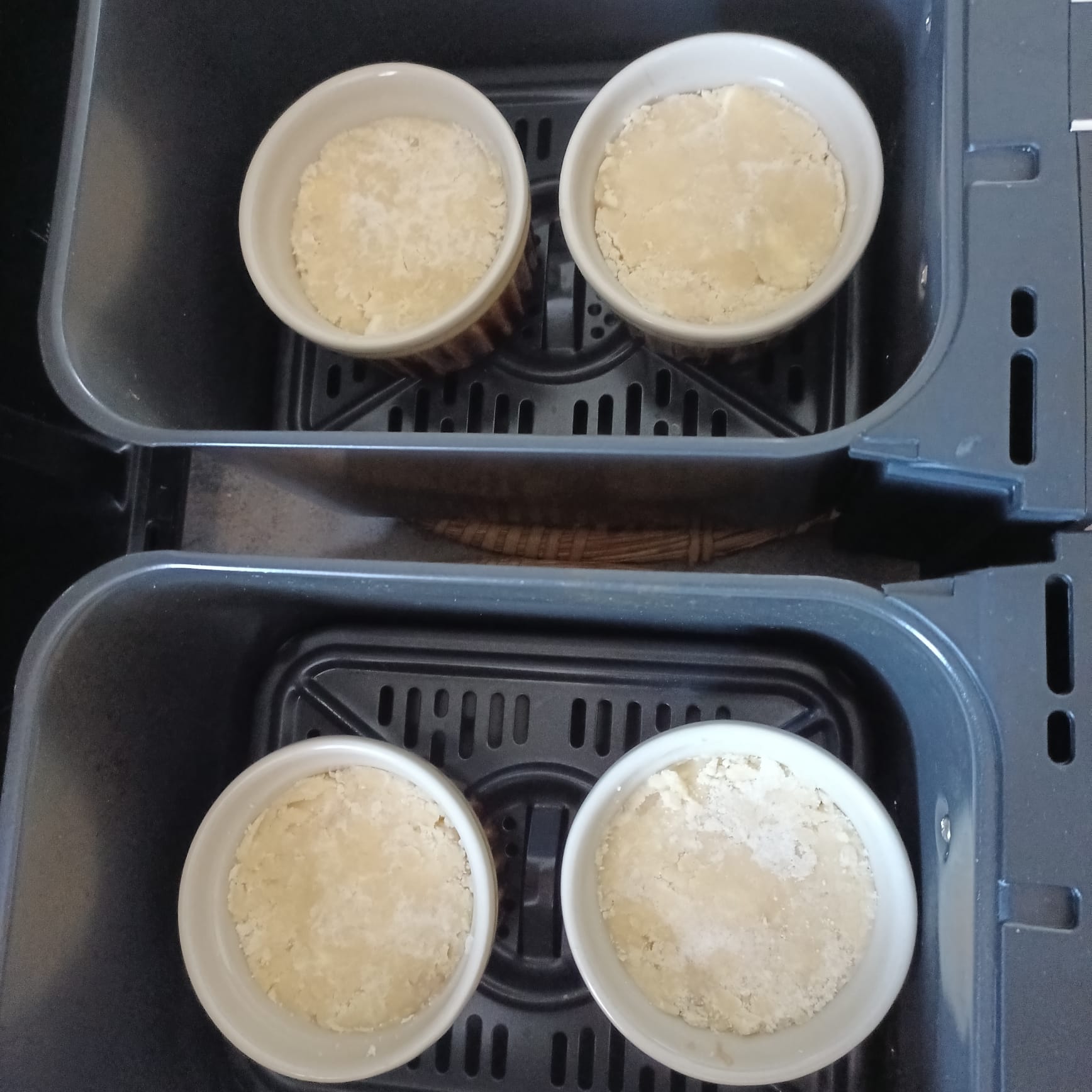 Mélanger les ingrédients de la pâte à crumble et la déposer sur tous les ramequins.
