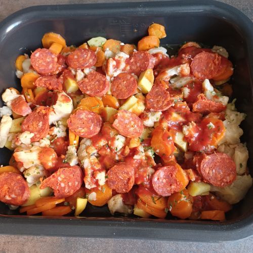 Ajouter 1/2 chorizo doux en rondelles ; ajouter une petite boite de sauce bolognaise + de la persillade, sel, poivre ; parsemer de 30 g de parmesan râpé.
