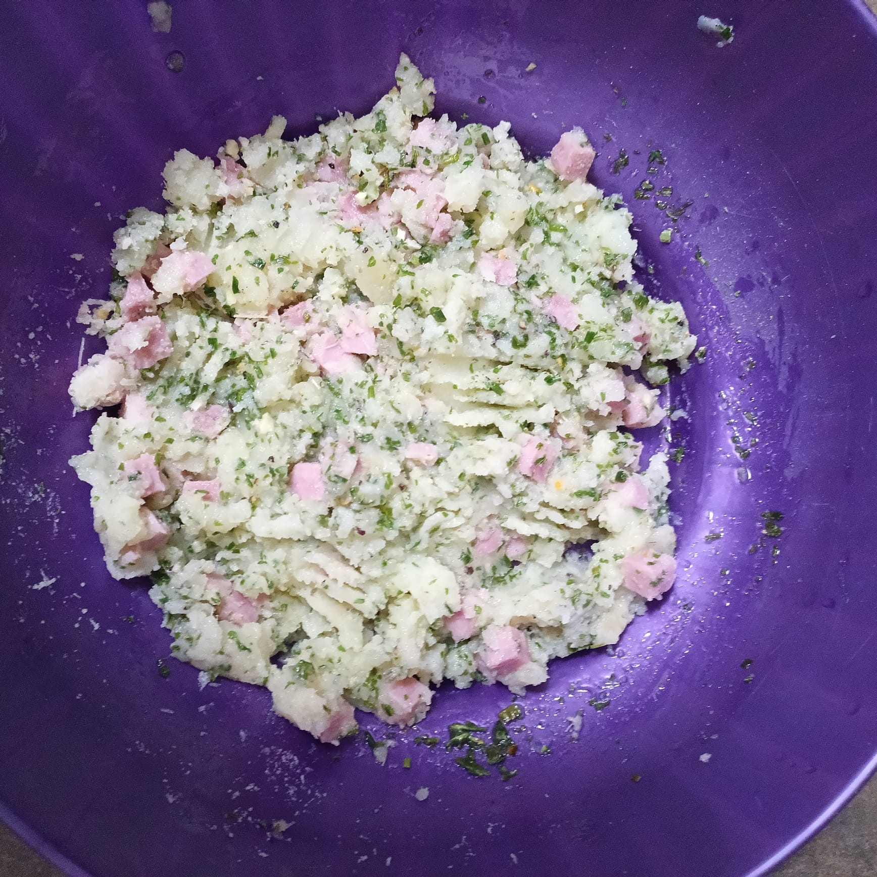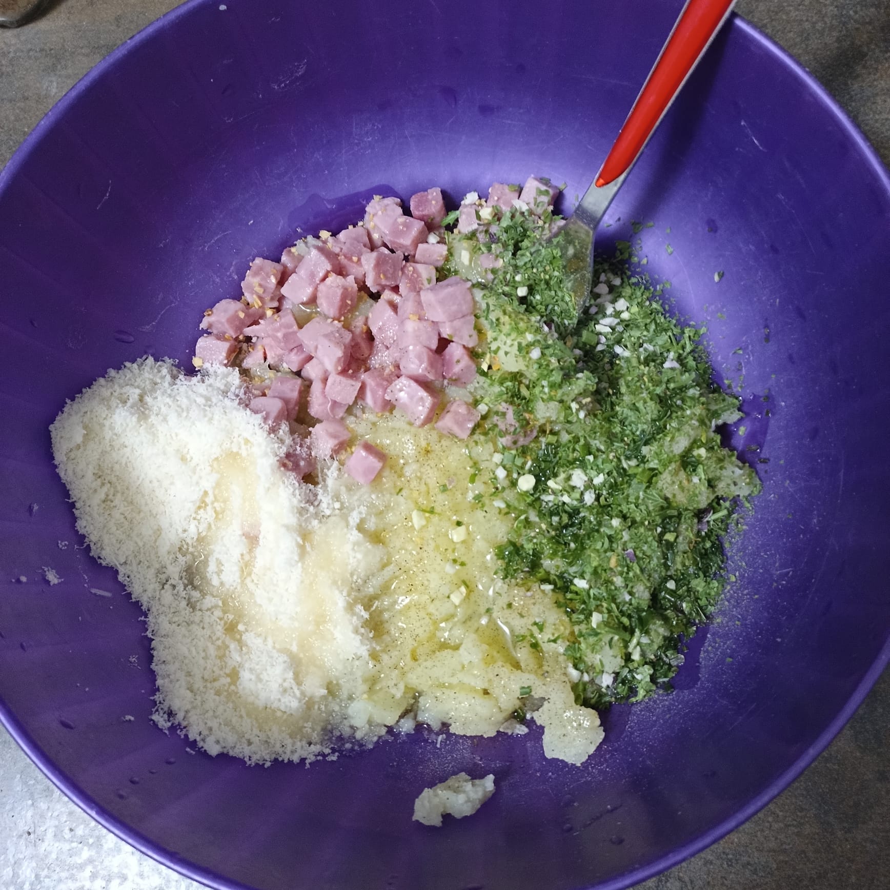 Evider la chair des pommes de terre ; ajouter de la persillade, du sel, du poivre, 30 g de parmesan râpé et 2 cuillères à soupe d'huile de colza ; mélanger le tout.