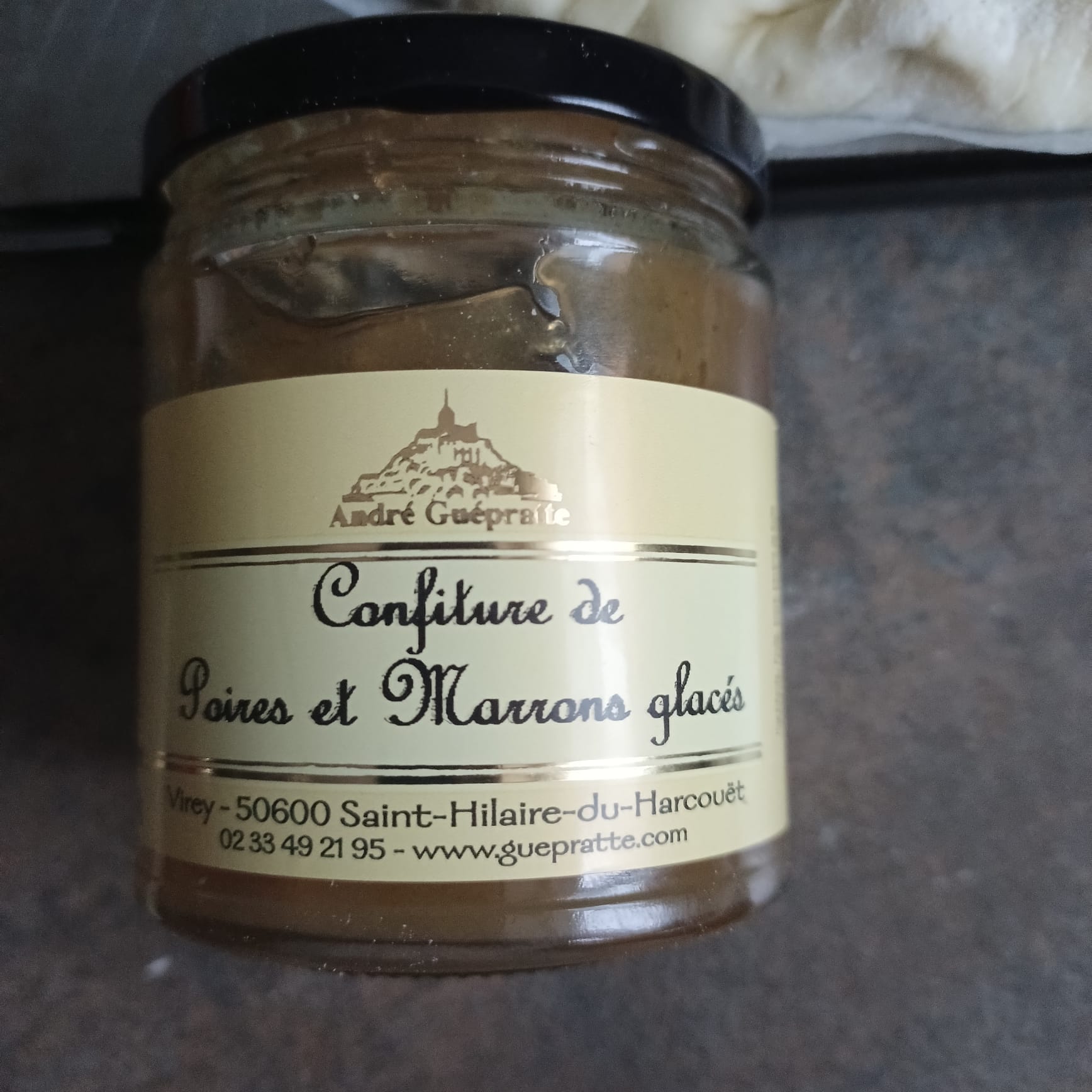 Badigeonner de confiture pommes/marrons glacés. Certains vont me demander où en trouver ..... pour ma part, je l'ai trouvé en boutique au Mont Saint Michel mais sur le net, vous pourrez en trouver.