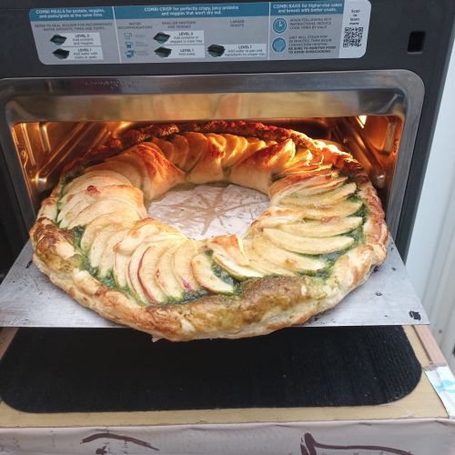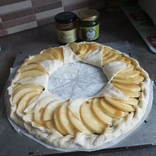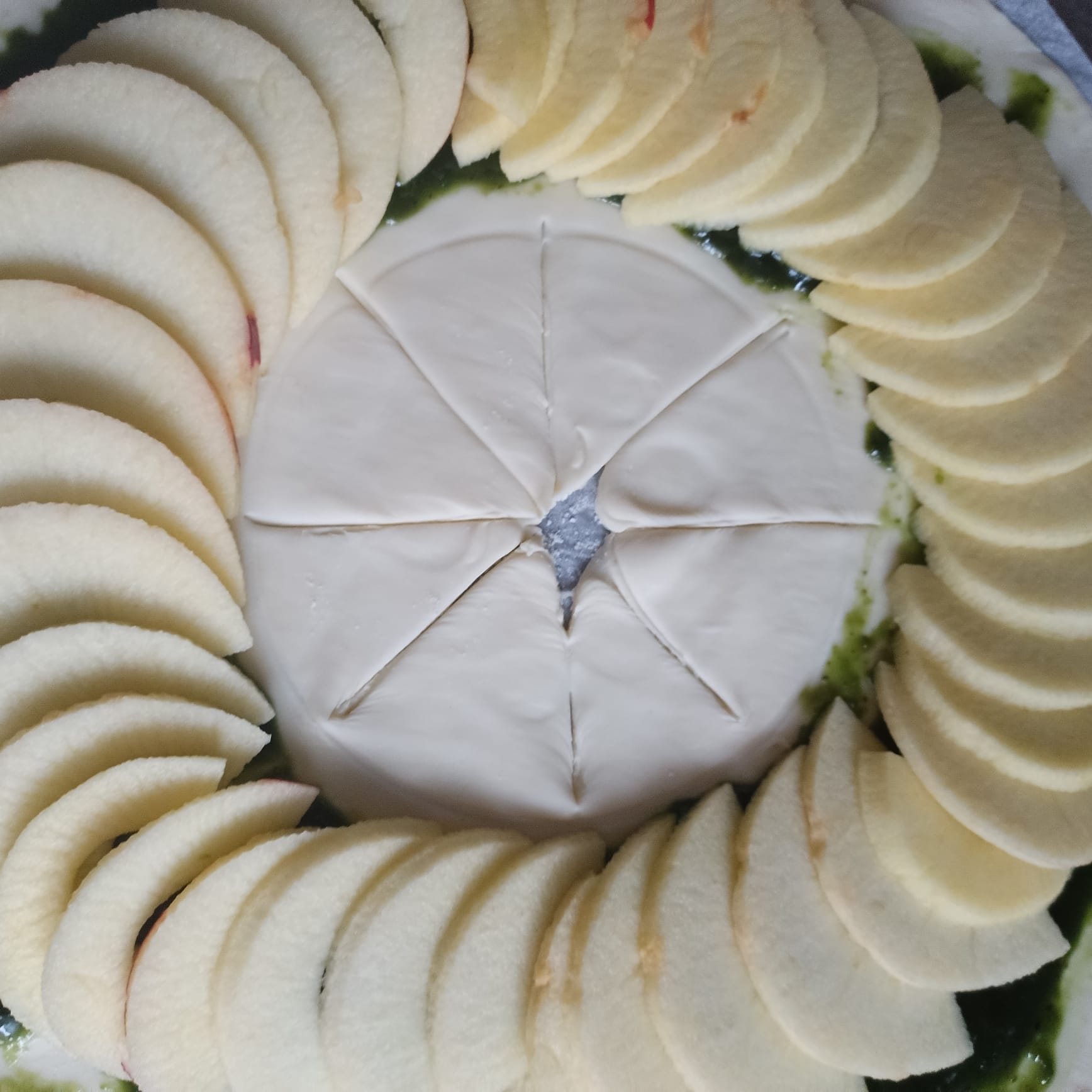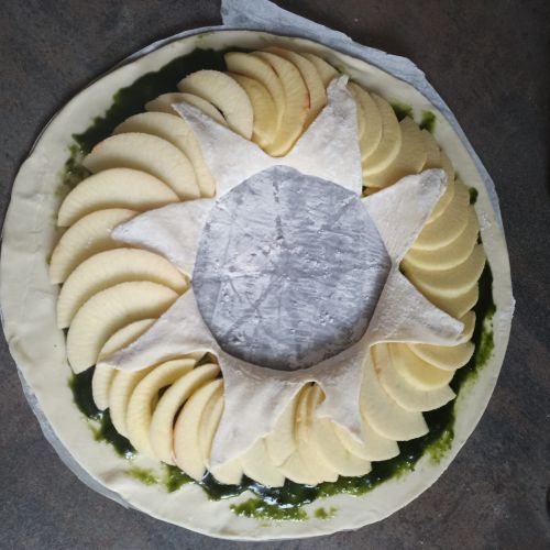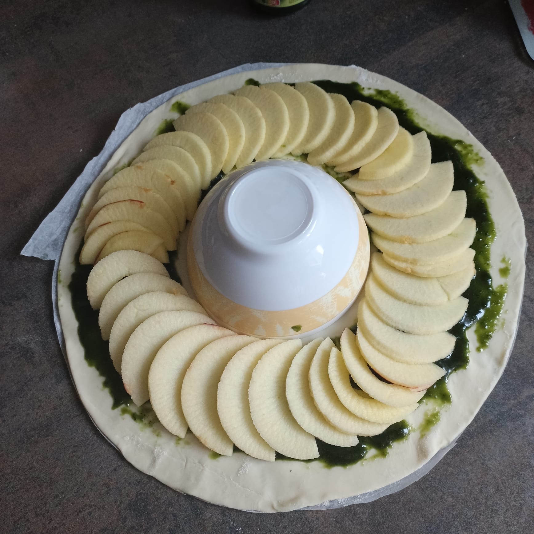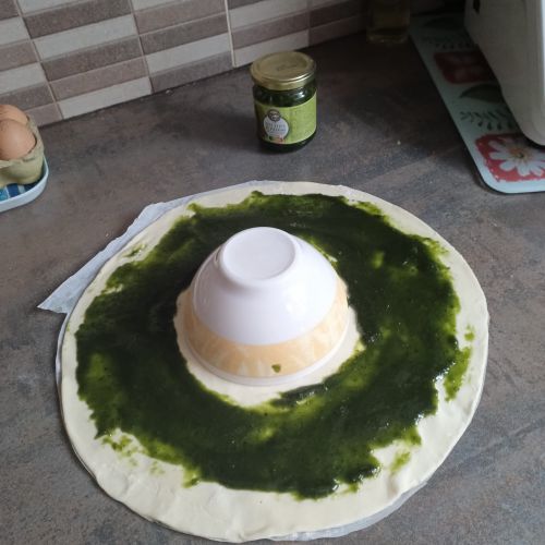 Etaler la pâte feuilletée ; mettre un bol au milieu ; étaler de la pâte de pistache comme sur la photo.