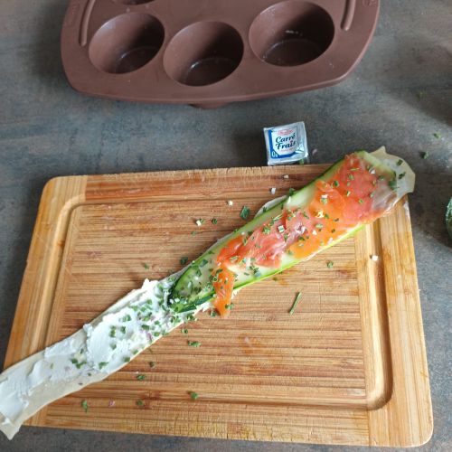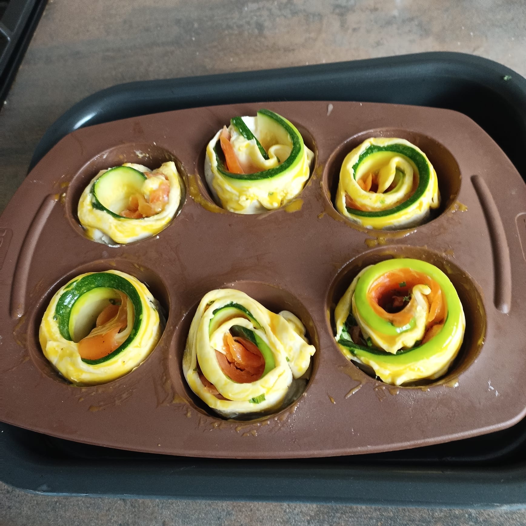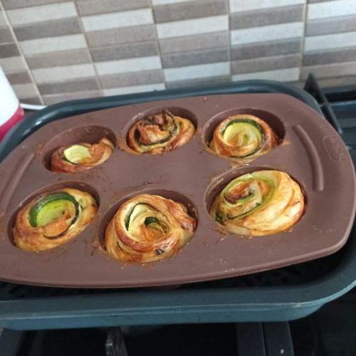 Rouler les bandes et les déposer dans un moule à muffins . Badigeonner au jaune d'oeuf pour la dorure à la cuisson.
