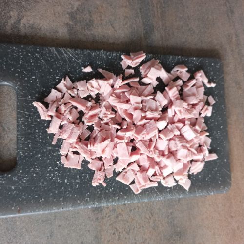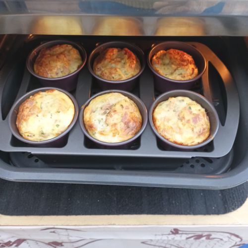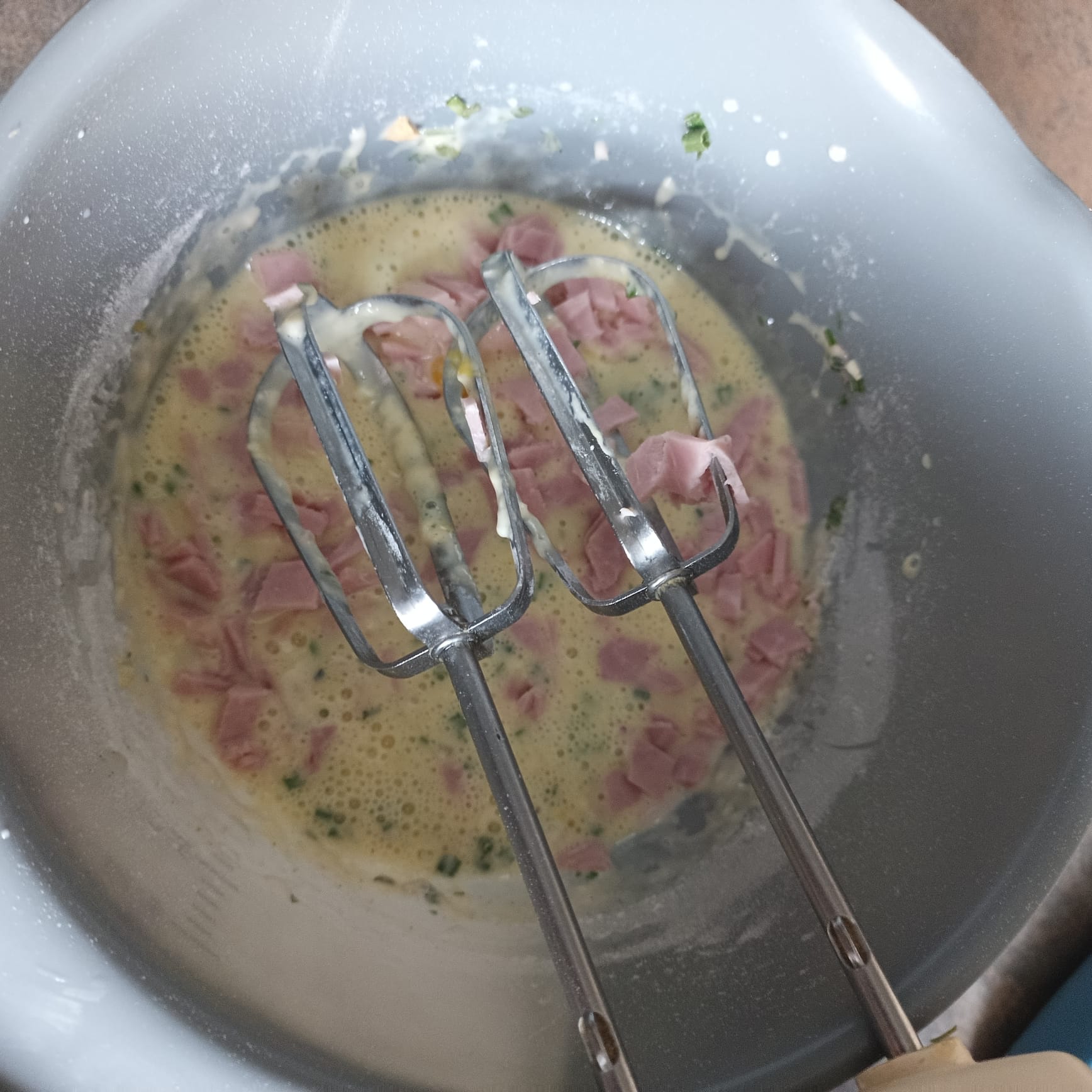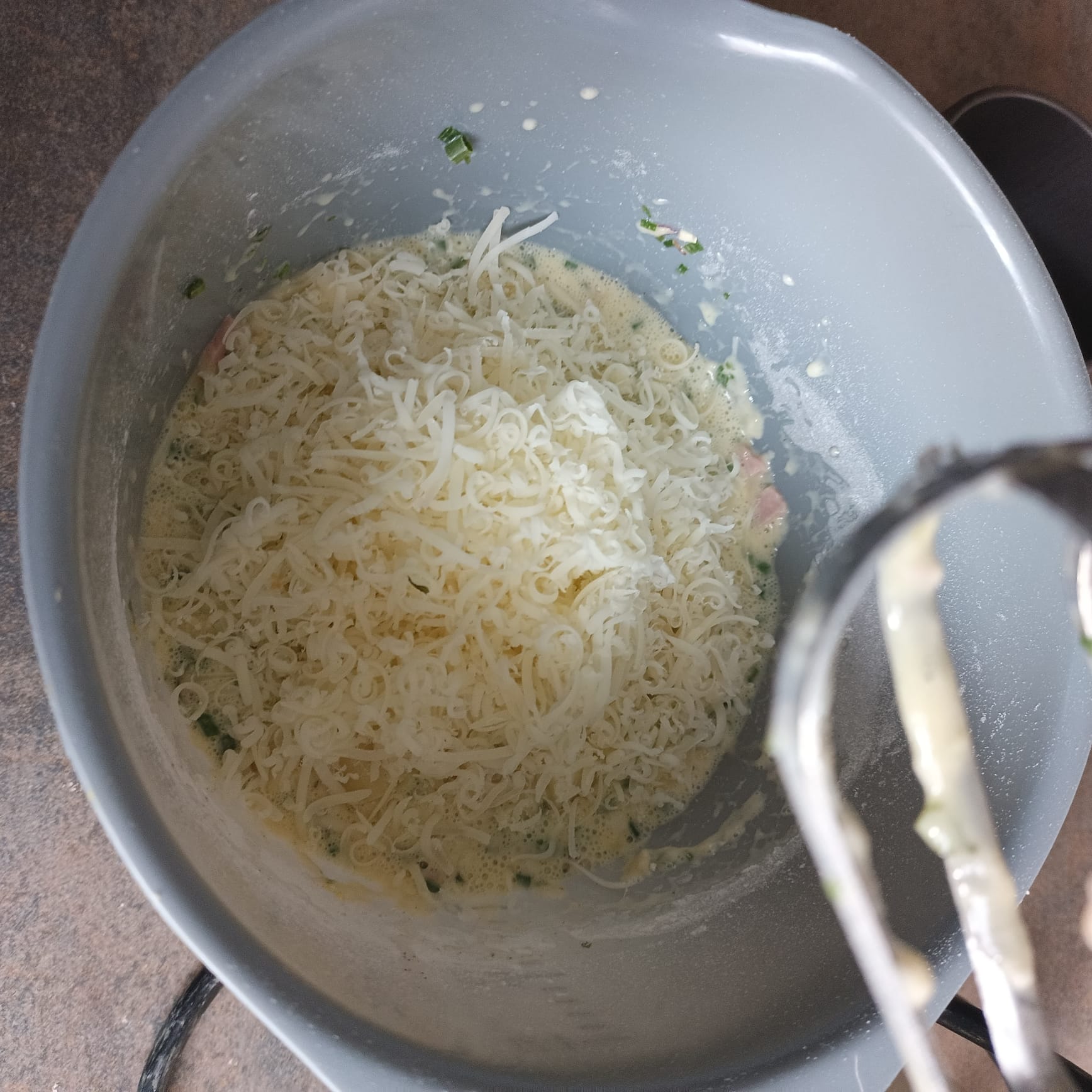 Mélanger 2 oeufs + 15 cl de lait demi-écrémé + 2 tranches de jambon coupées en petits morceaux + 2 cuillères à soupe de farine + sel, poivre + 40 g de Comté râpé