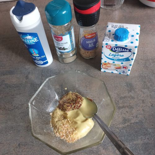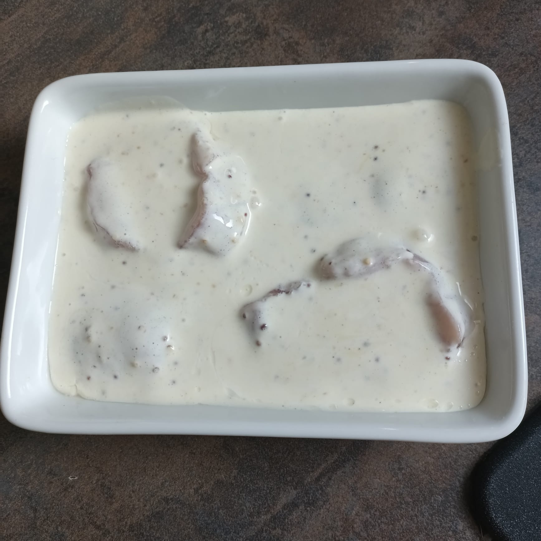 Déposer les médaillons dans un plat ; mélanger 2 cuillères à soupe de moutarde fine + 1 cuillère à soupe de moutarde à l'ancienne + 3 cuillères de crème liquide ; en mettre sous les médaillons et ajouter le reste sur le dessus.