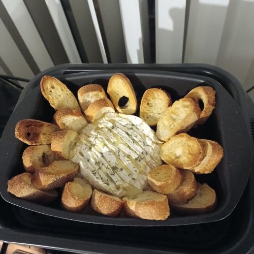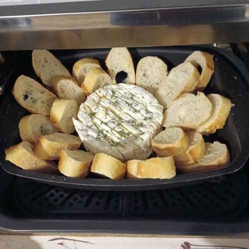 Découper une baguette de pain en tranches et les poser tout autour du fromage.