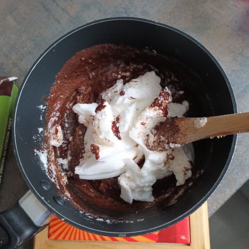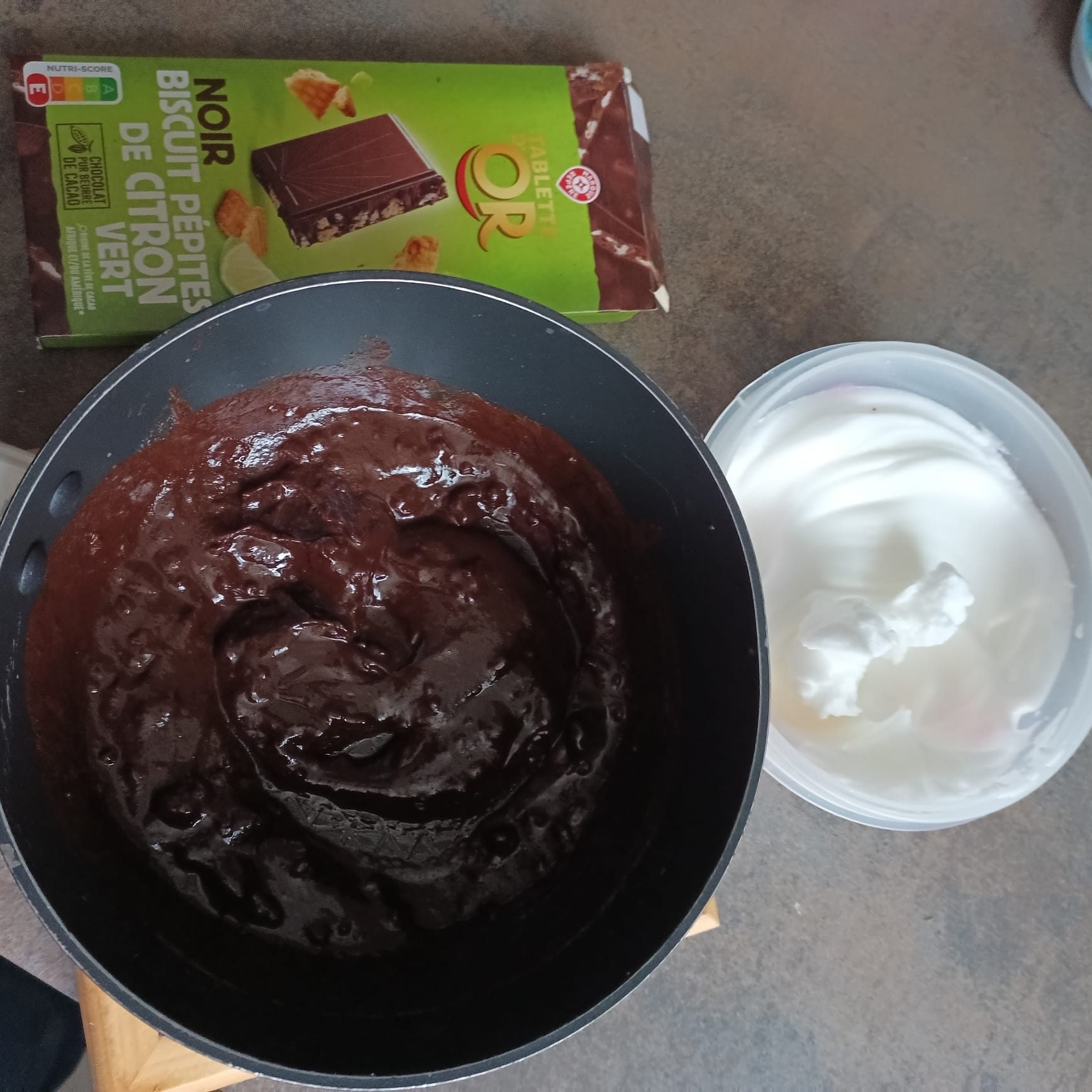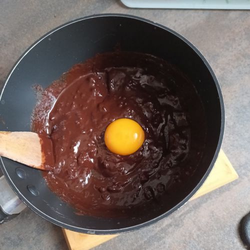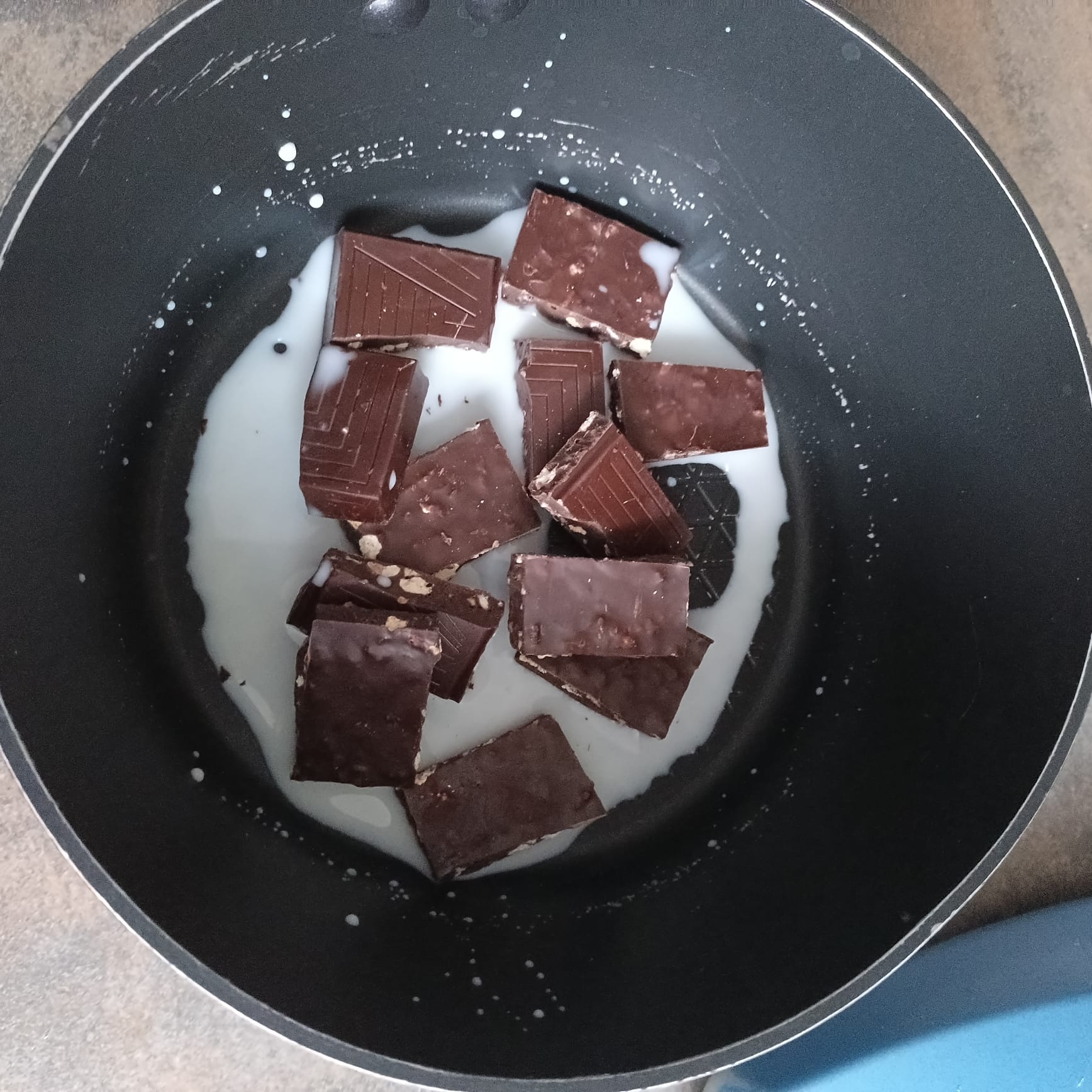 Dans une casserole, mettre 100 g de chocolat noir en carrés découpés + 1 cuillère à soupe de lait + 1/2 cuillère à soupe d'eau froide. Faire fondre sur feux doux.