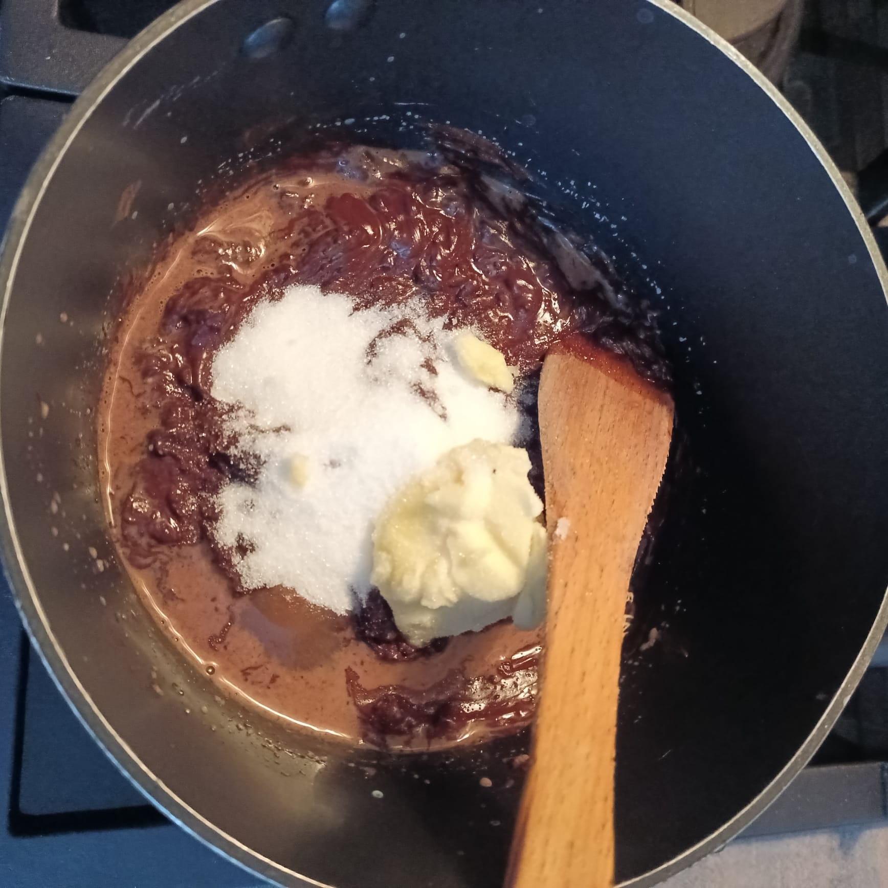 Ajouter le beurre mou et le sucre et remettre quelques minutes sur feux doux le temps que le beurre et le sucre fondent.