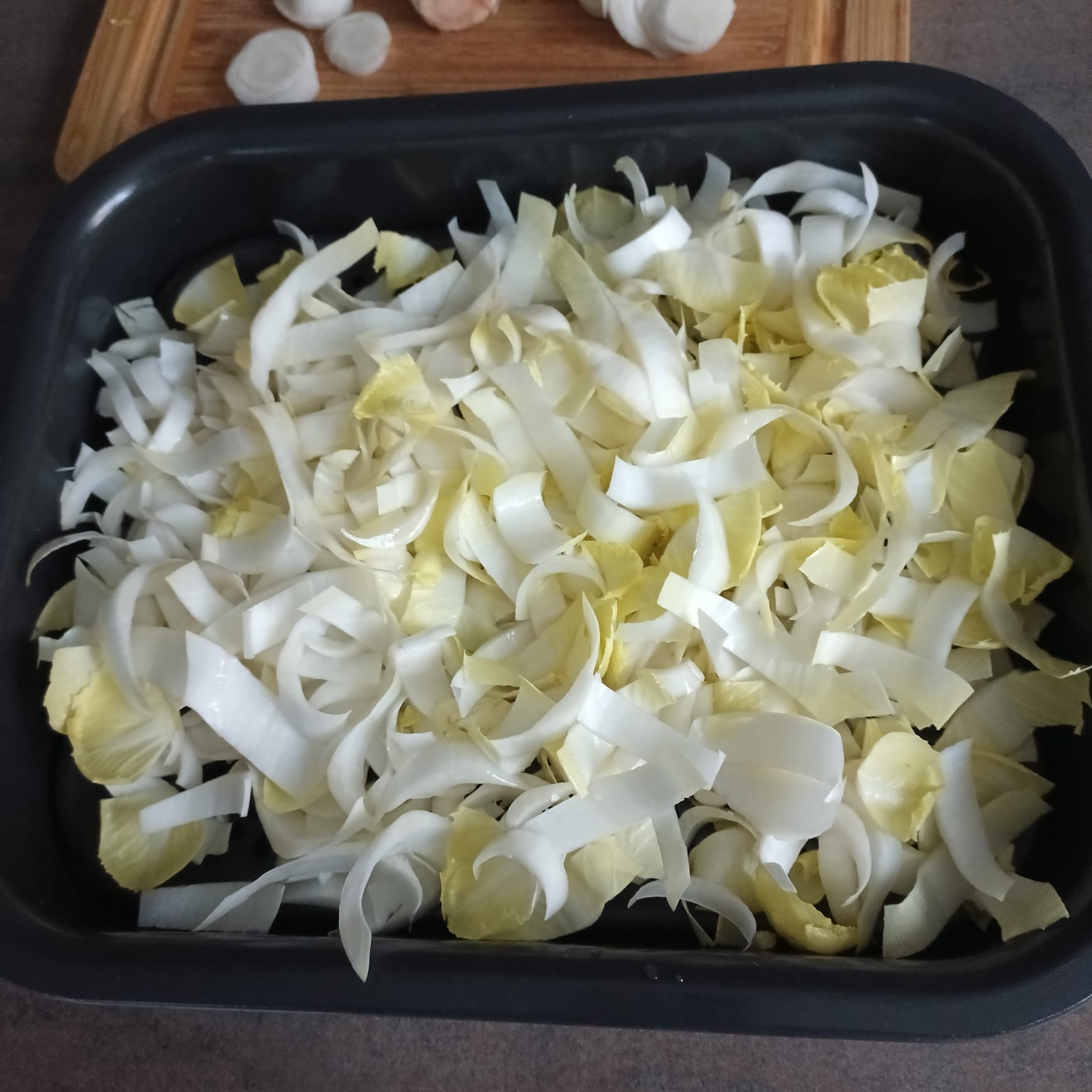 Emincer les endives et les cuire en mode STEAM du combi Ninja durant 10 minutes avec 30 cl d'eau chaude dans le plat avec la grille en partie basse du combi.