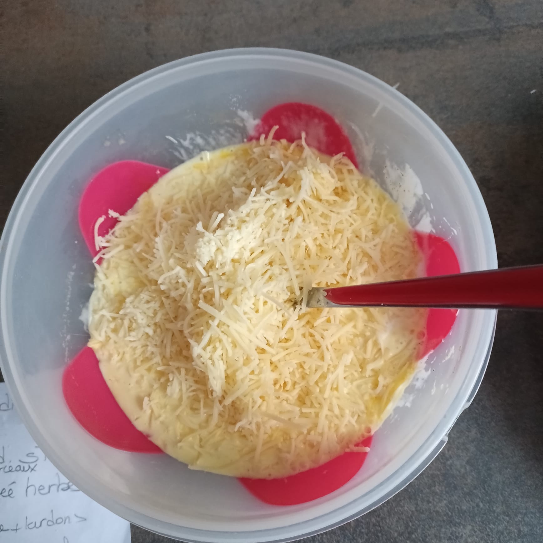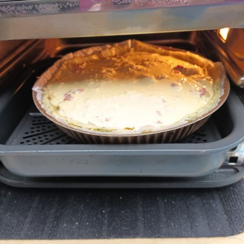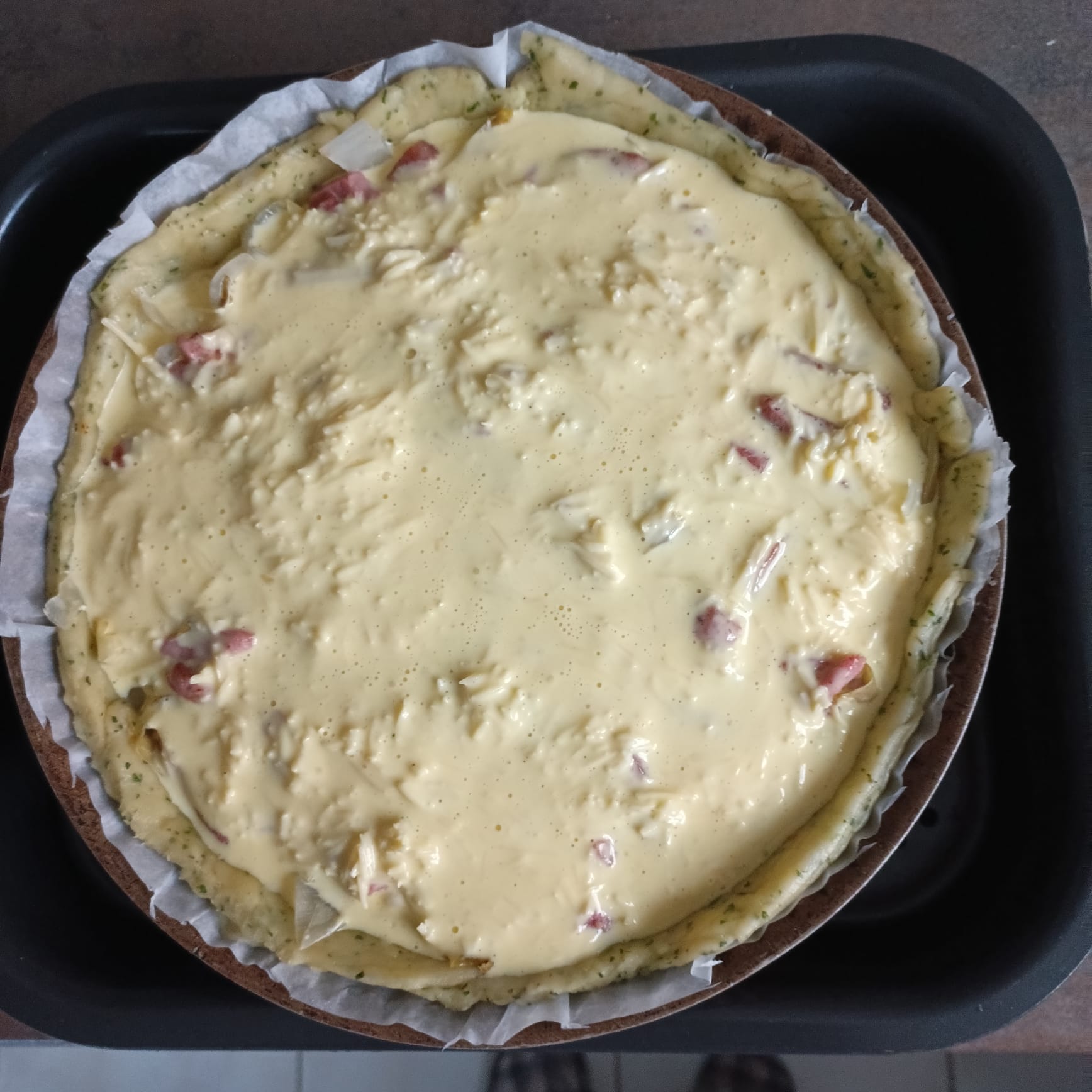 Mélanger 2 oeufs + 20 cl de crème liquide + 70 g de Comté râpé , sel poivre ; verser cette préparation sur la tarte.