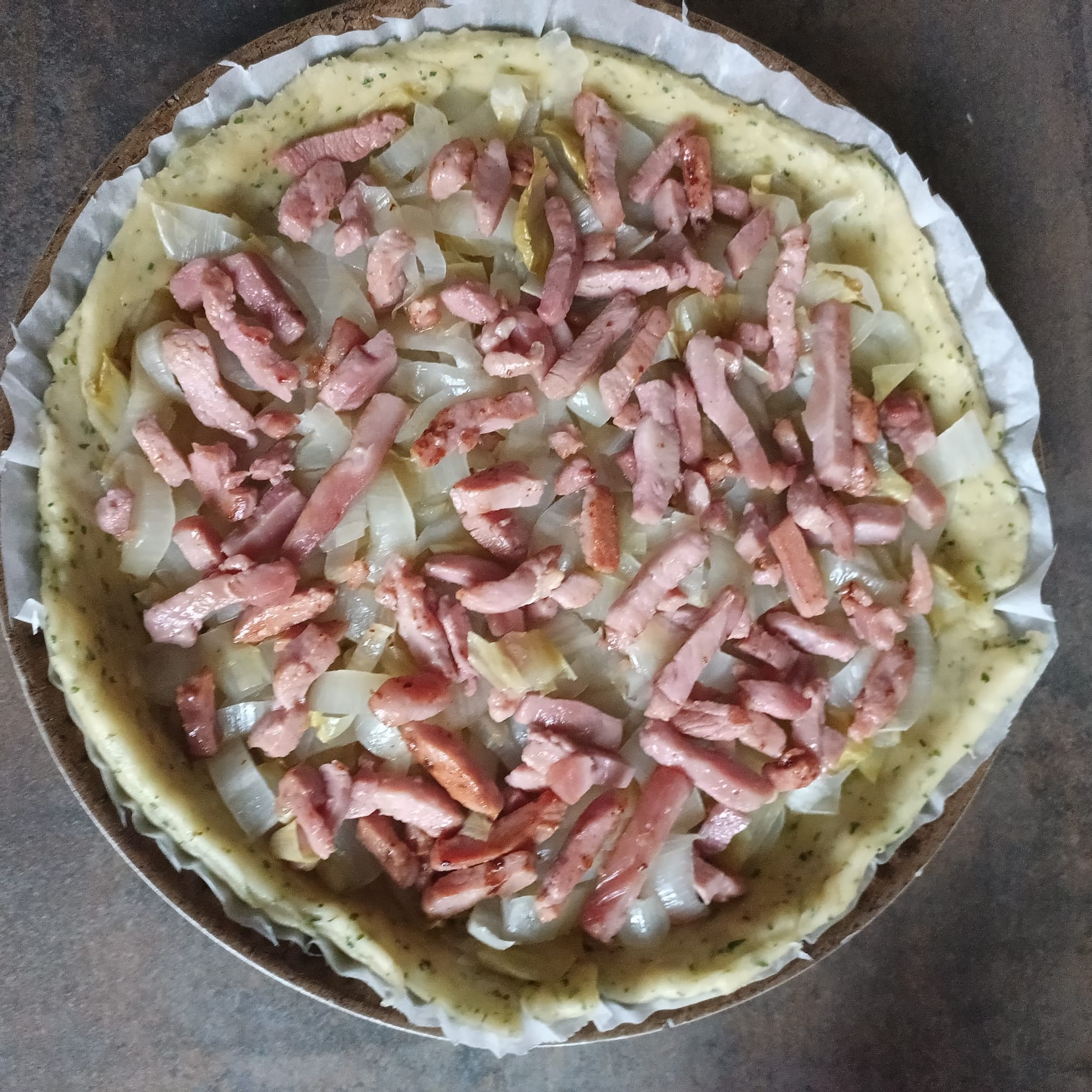 Déposer les morceaux d'endives sur la pâte à tarte ; cuire les lardons de volaille dans une poêle et laisser refroidir ; déposer les lardons de volaille sur les endives.