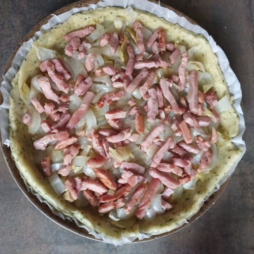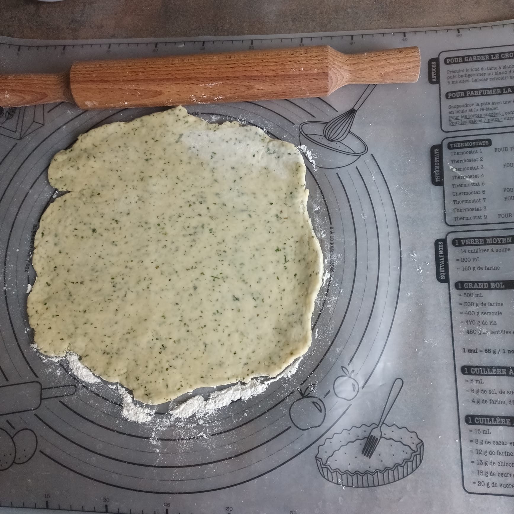 Préparation de la pâte brisée : 250 g de farine + 8 cl d'eau + 8 cl d'huile de colza + sel + herbes de Provence