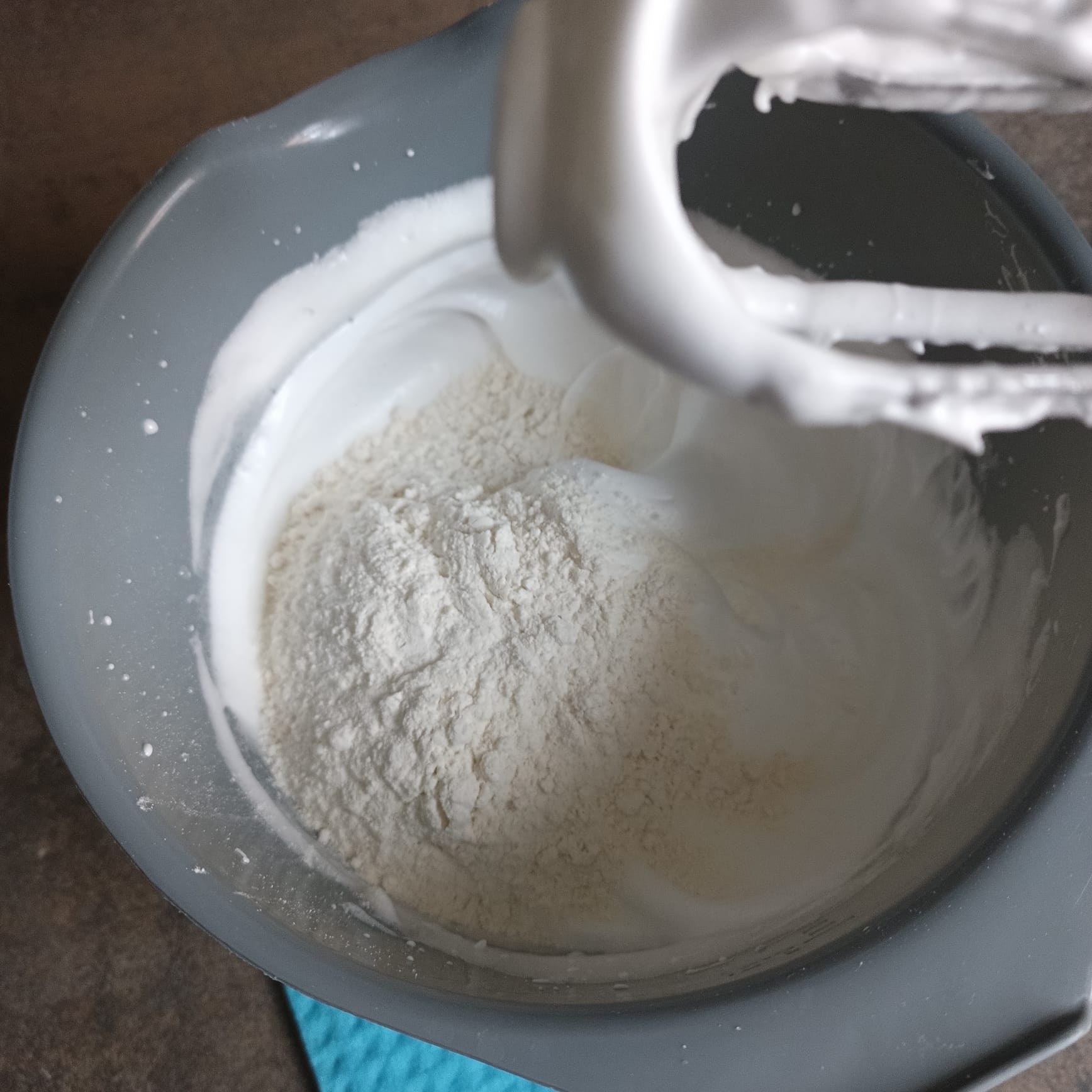 Ajouter 65 g de farine tamisée et mélanger délicatement.