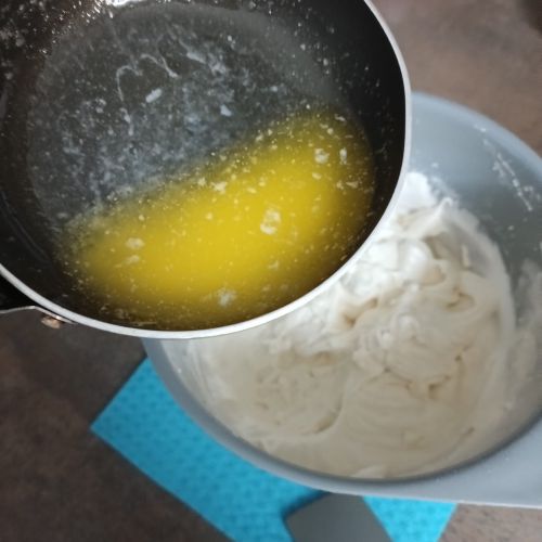 Ajouter 35 g de beurre fondu refroidi et mélanger délicatement.