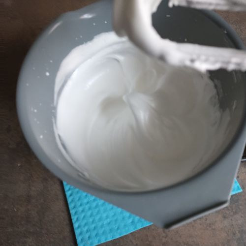 Battre 3 blancs d'oeufs en neige ferme ; quand les blancs deviennent mousseux, ajouter par petite dose, 70 g de sucre jusqu'à ce qu'ils deviennent fermes.