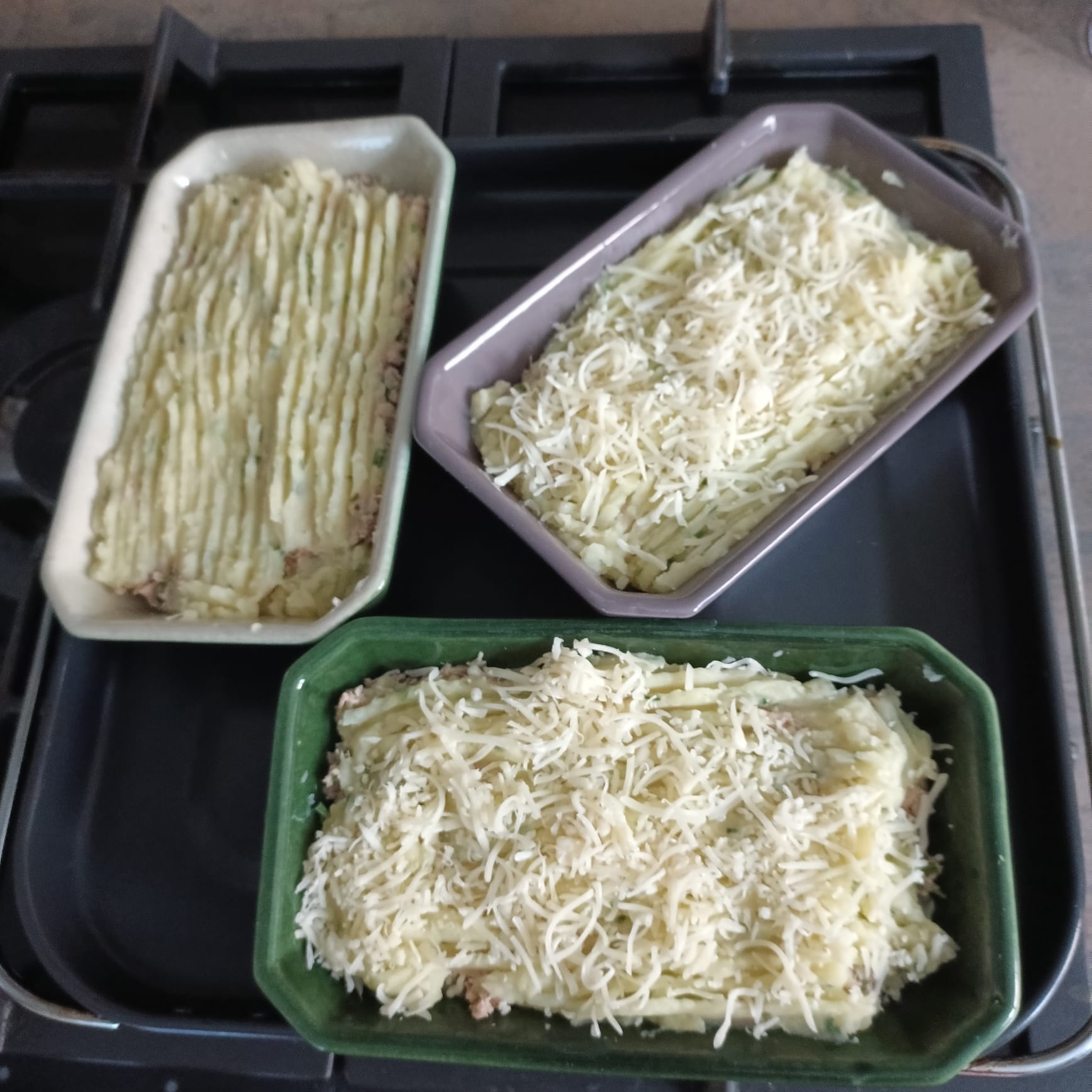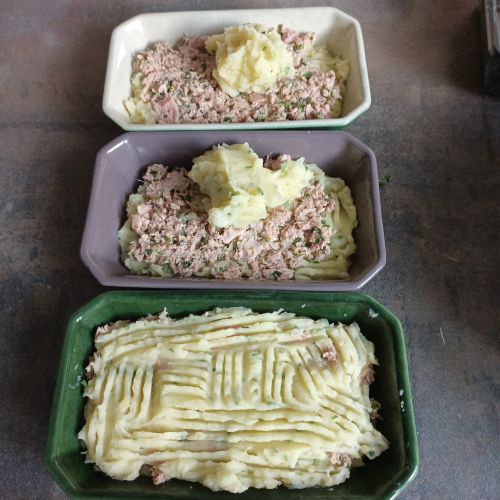 Déposer une couche de purée. Ajouter le thon à la ciboulette. Remettre une couche de purée.