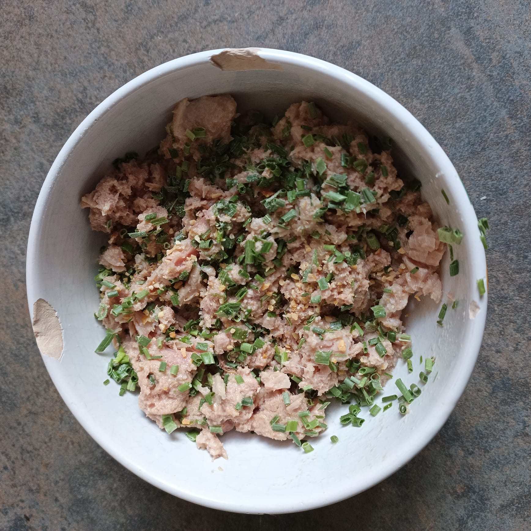 Mélanger une boite de thon de 140 g avec un peu de poivre et de la ciboulette séchée.