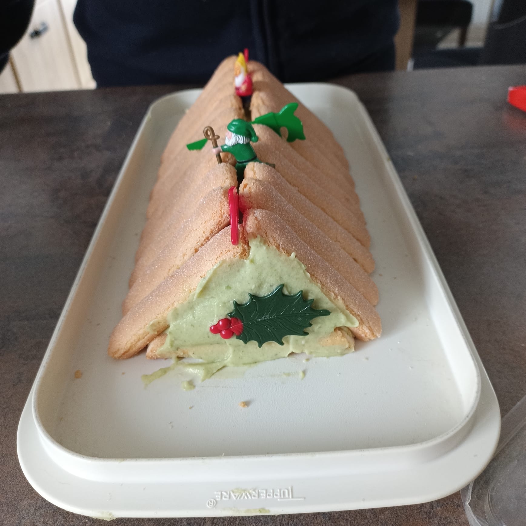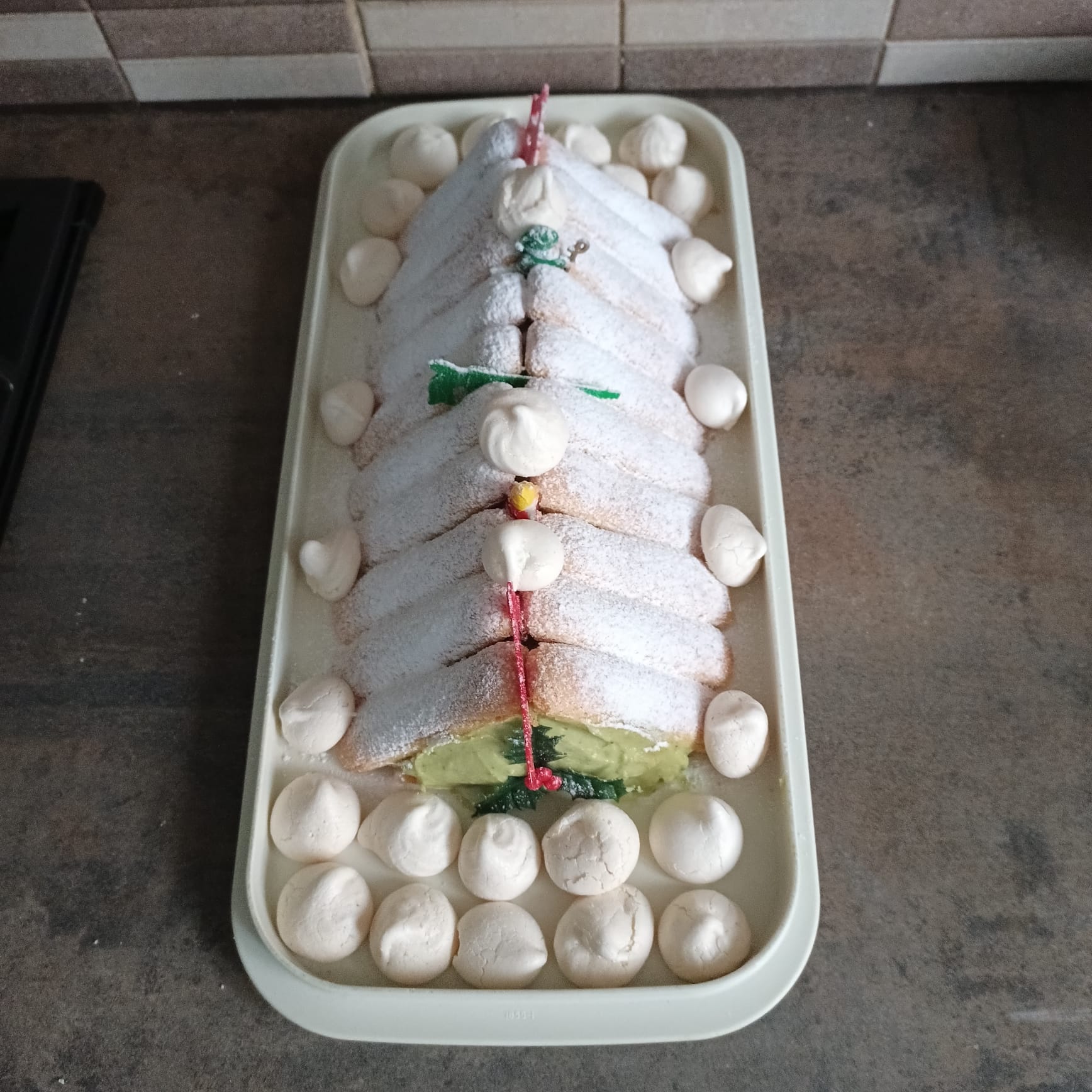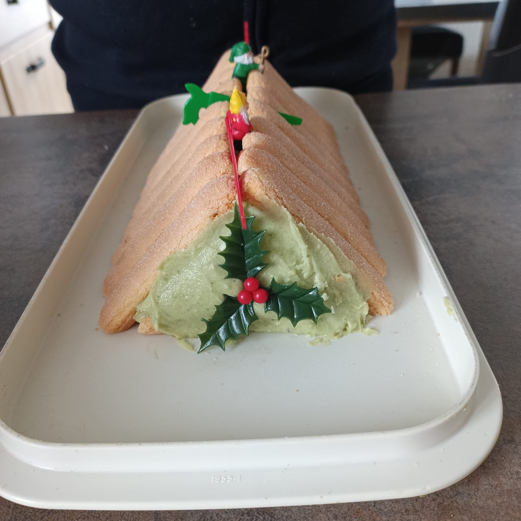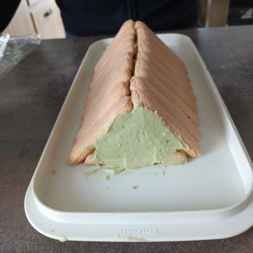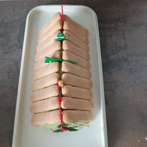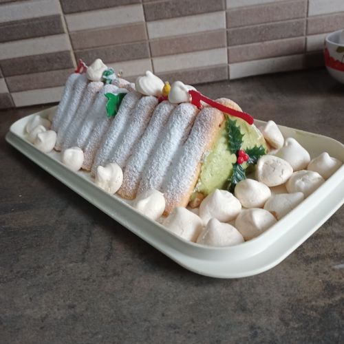Ma bûche est constituée de boudoirs et d'une crème au beurre à la pistache(beurre et crème pâtissière )