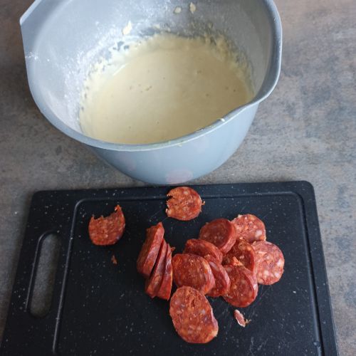Mélanger 2 oeufs + 10 cl de lait demi-écrémé +1 cuillère à soupe d'huile. Ajouter 150 g de farine, 1/2 sachet de levure chimique et 15 rondelles de chorizo doux.