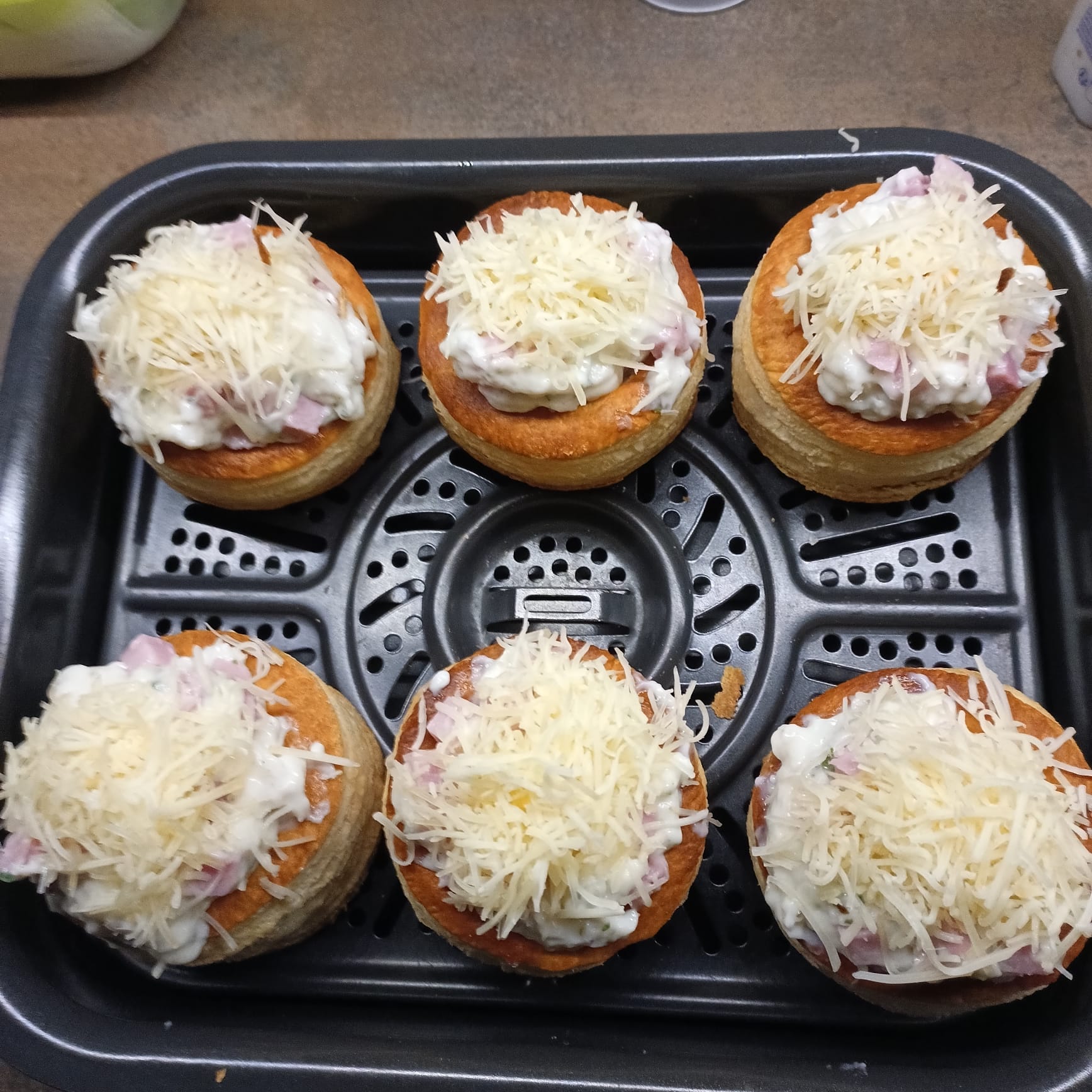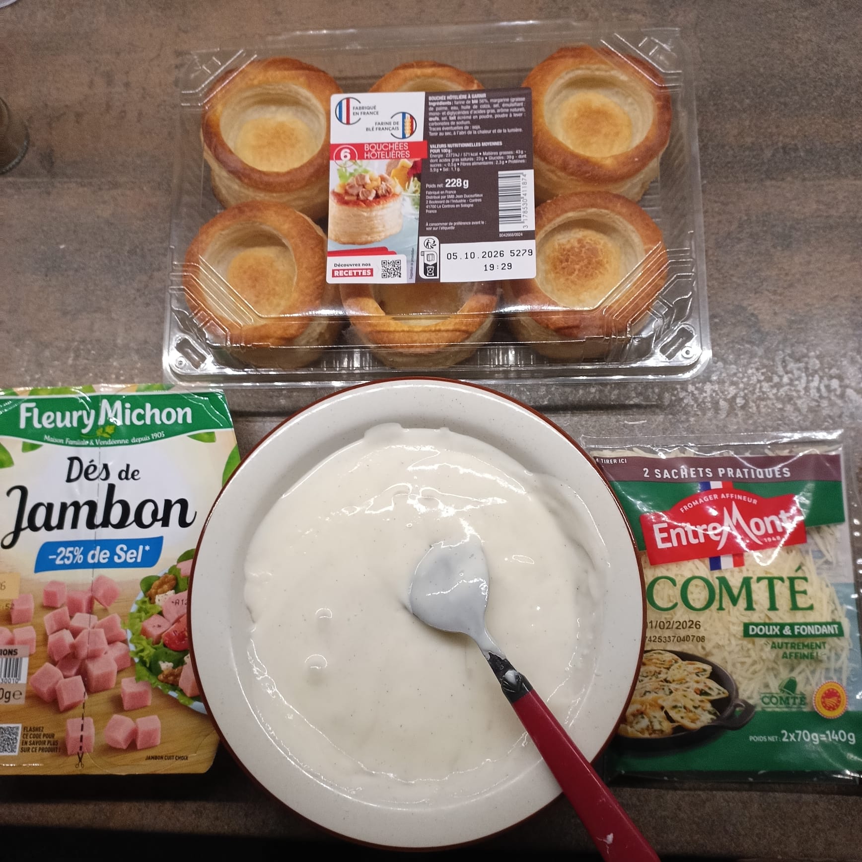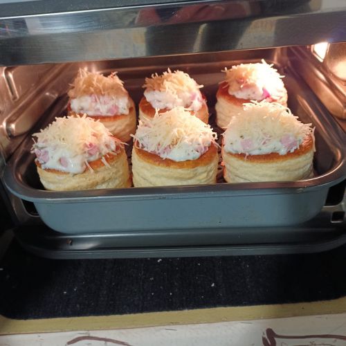 Après refroidissement de la béchamel, y incorporer les dés de jambon et remplir les bouchées. Déposer des tas de Comté râpé sur chaque bouchée.