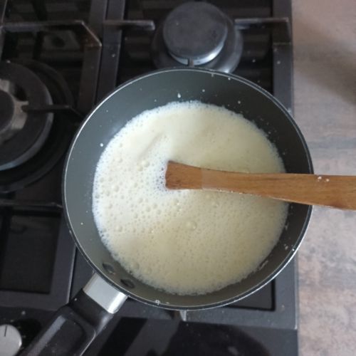 Chauffer 50 cl de lait demi-écrémé + 2 sachets de vanille en poudre.