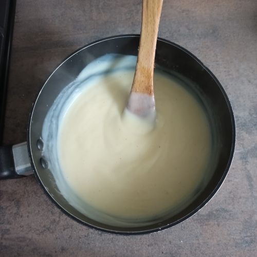 Ajouter le lait . Mélanger et remettre dans la casserole à chauffer jusqu'à épaississement.