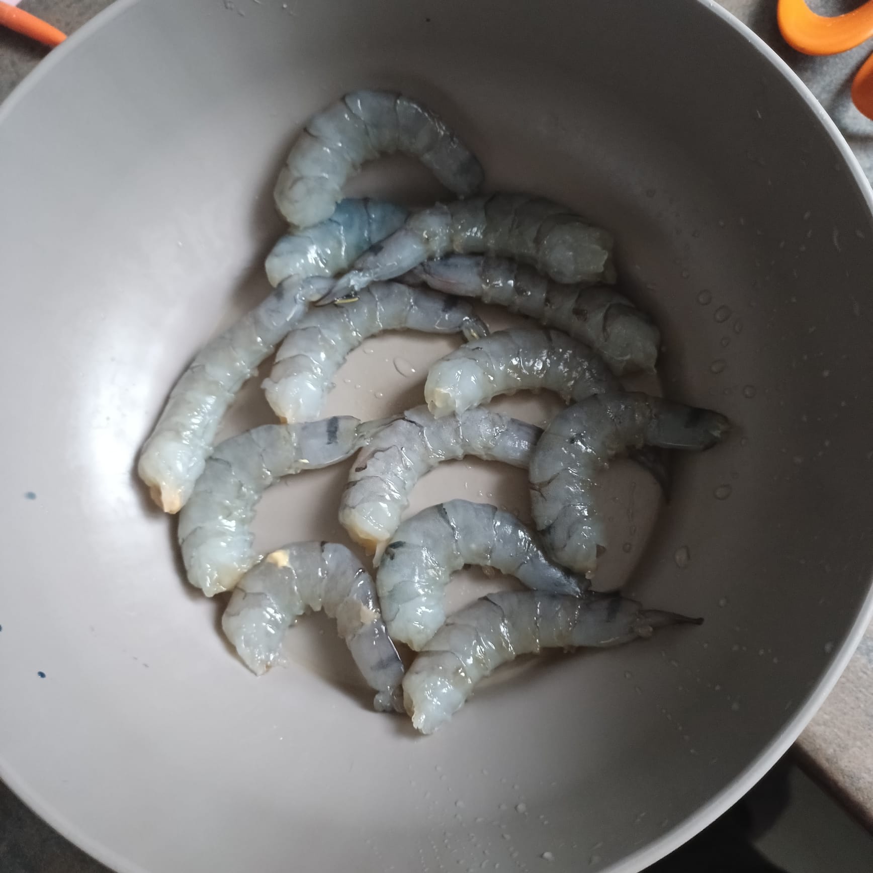 Décortiquer les gambas ; les faire mariner durant 1 heure dans un mélange d'huile + sel poivre + paprika ....