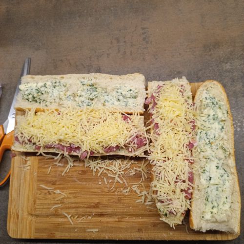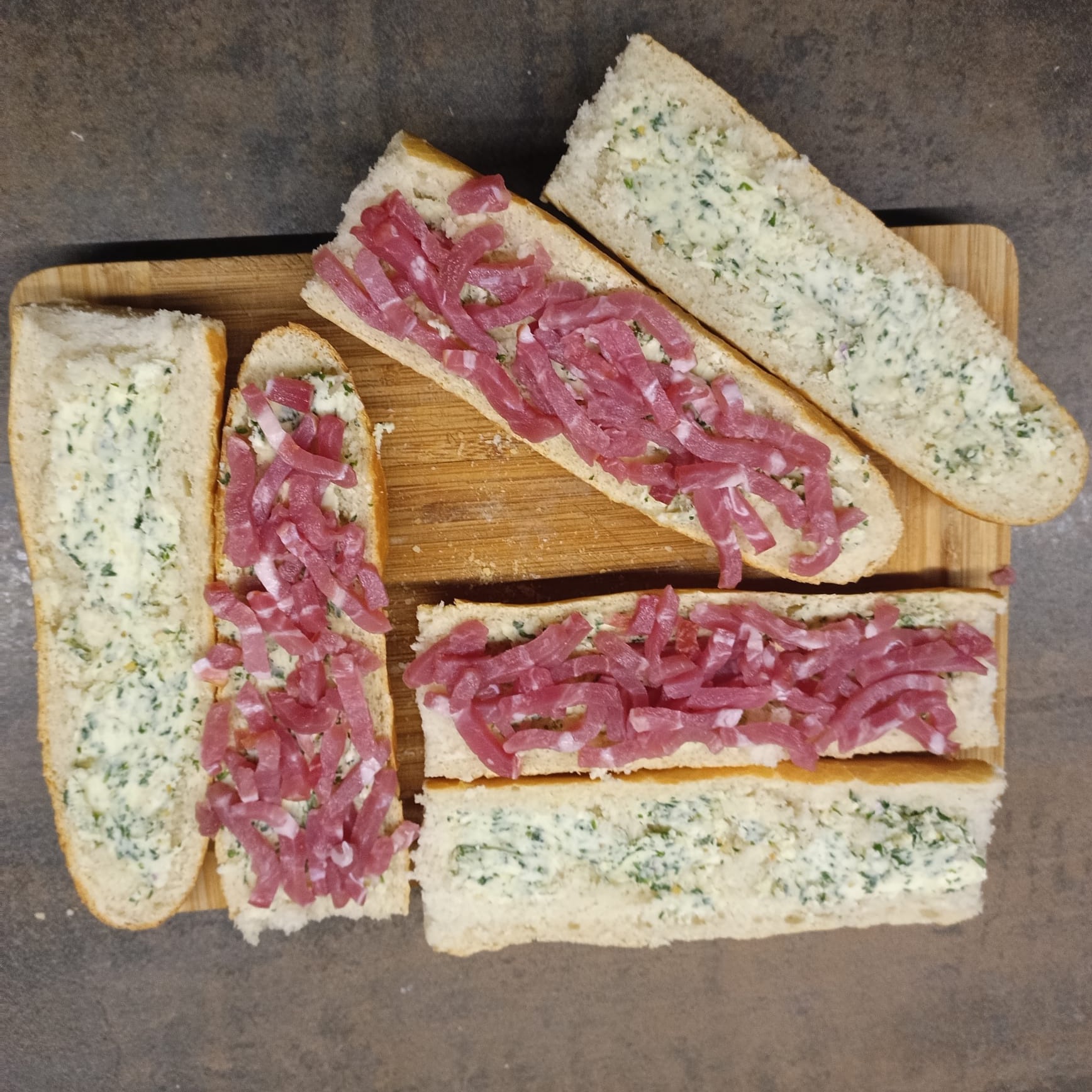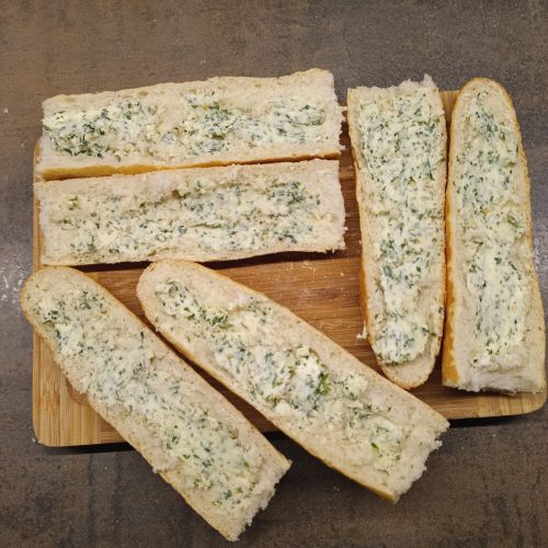 Couper une baguette en 3 parts égales en longueur et les couper en 2 parties...... Tartiner de beurre mélangé avec de la persillade.