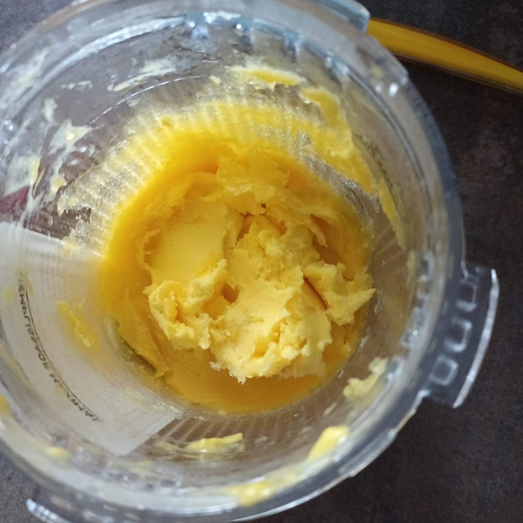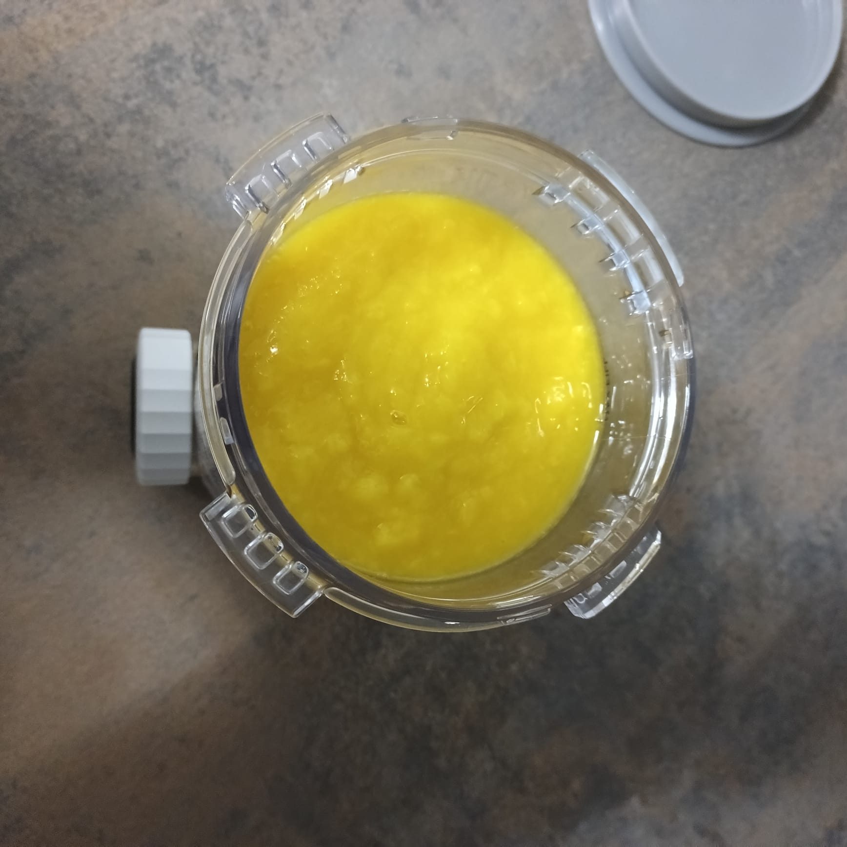 Ecraser la chair de 2 mangues mûres ; ajouter 20 g de sucre et 2 cuillères à soupe d'eau froide.