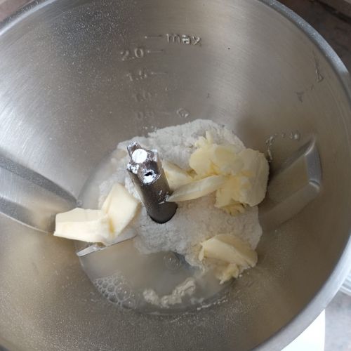 150 g de farine + 75 g de beurre mou + sel + 50 g d'eau froide