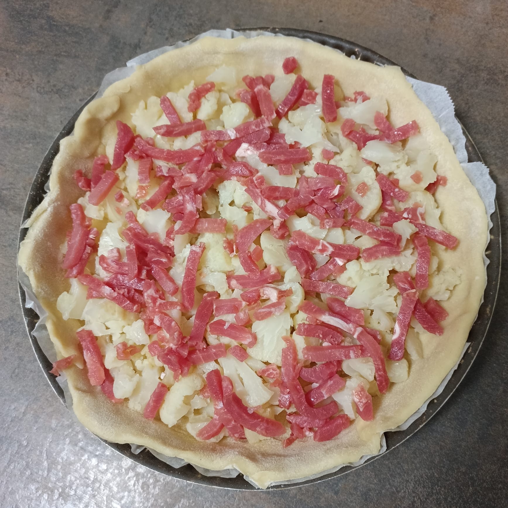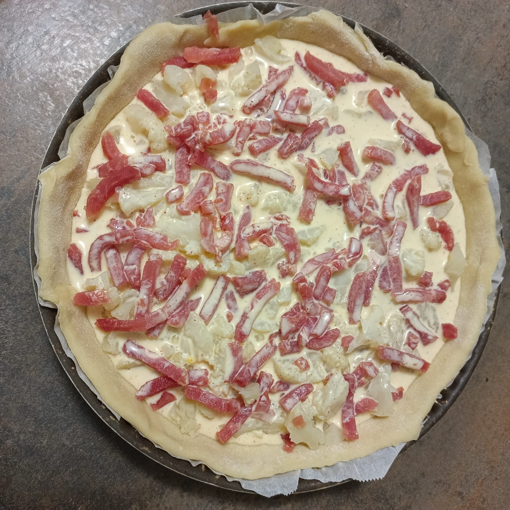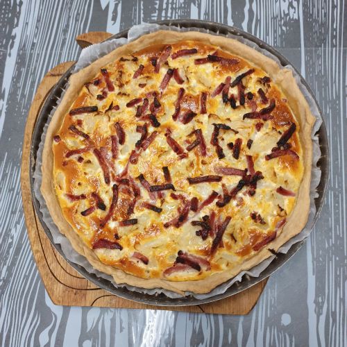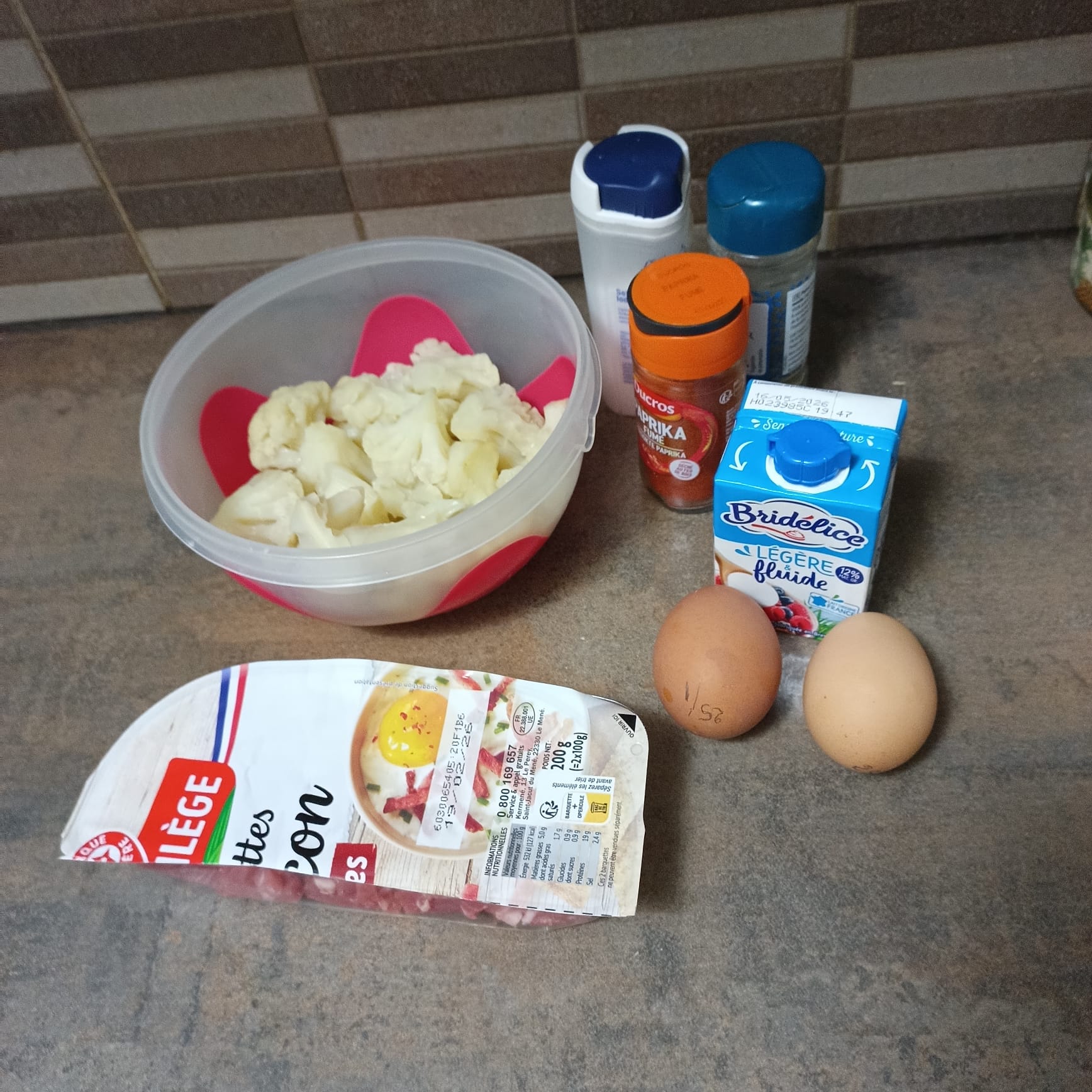 Déposer 400 g de chou fleur cuit et 75 g de lamelles de bacon fumé.