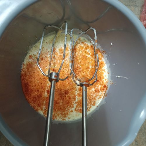 Mélanger 2 oeufs + 20 cl de crème liquide + sel poivre paprika.