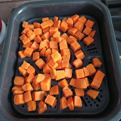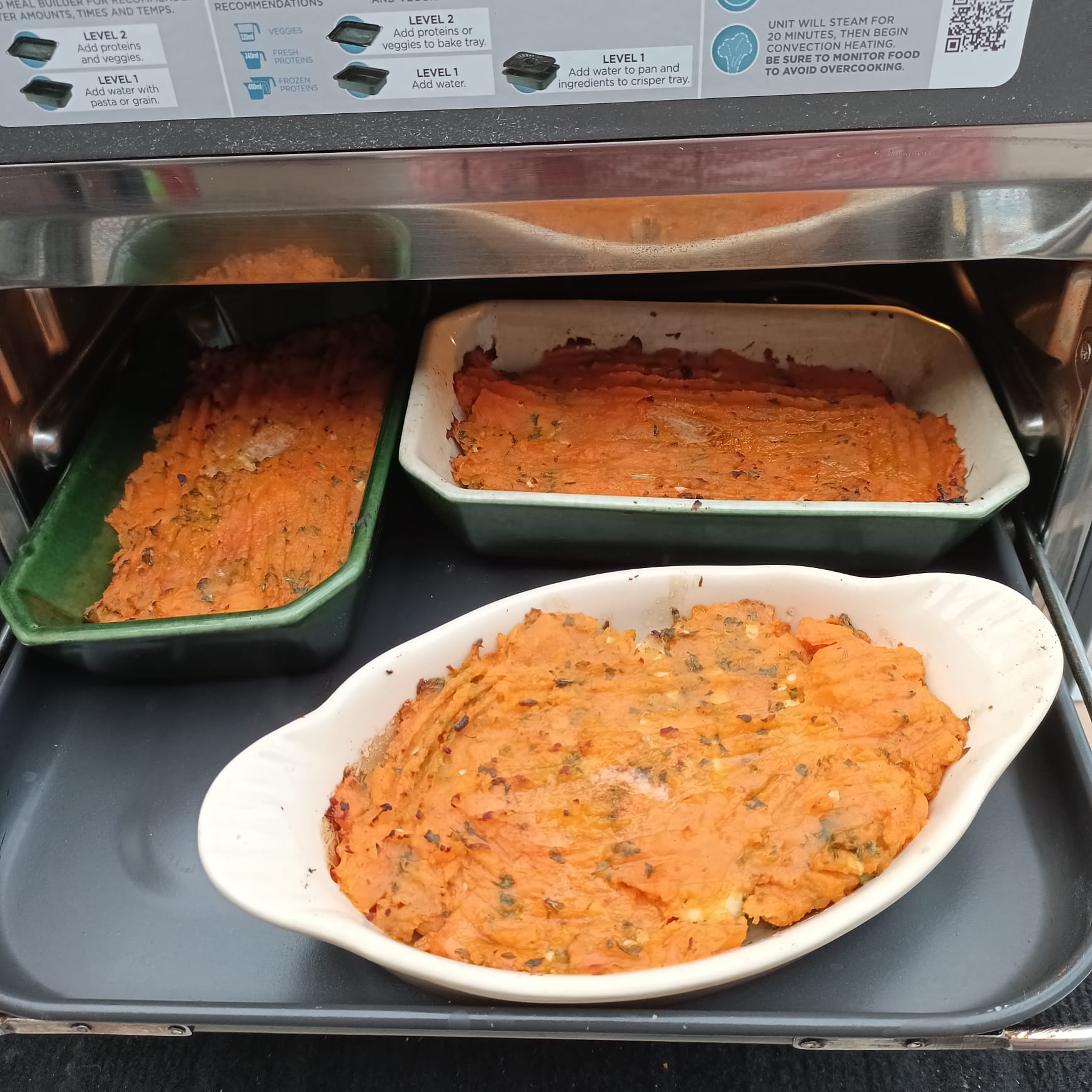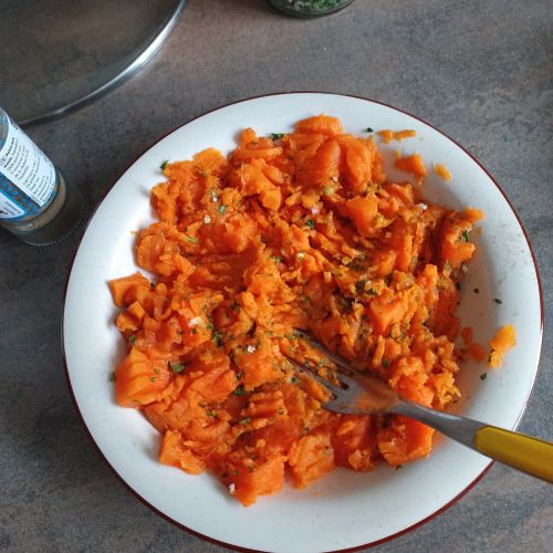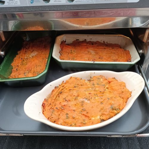 Cuire en mode STEAM durant 10 minutes , 450 g de patates douces soit surgelées soit coupées en petits dés. Réduire en purée, saler, poivrer et un peu de persillade.