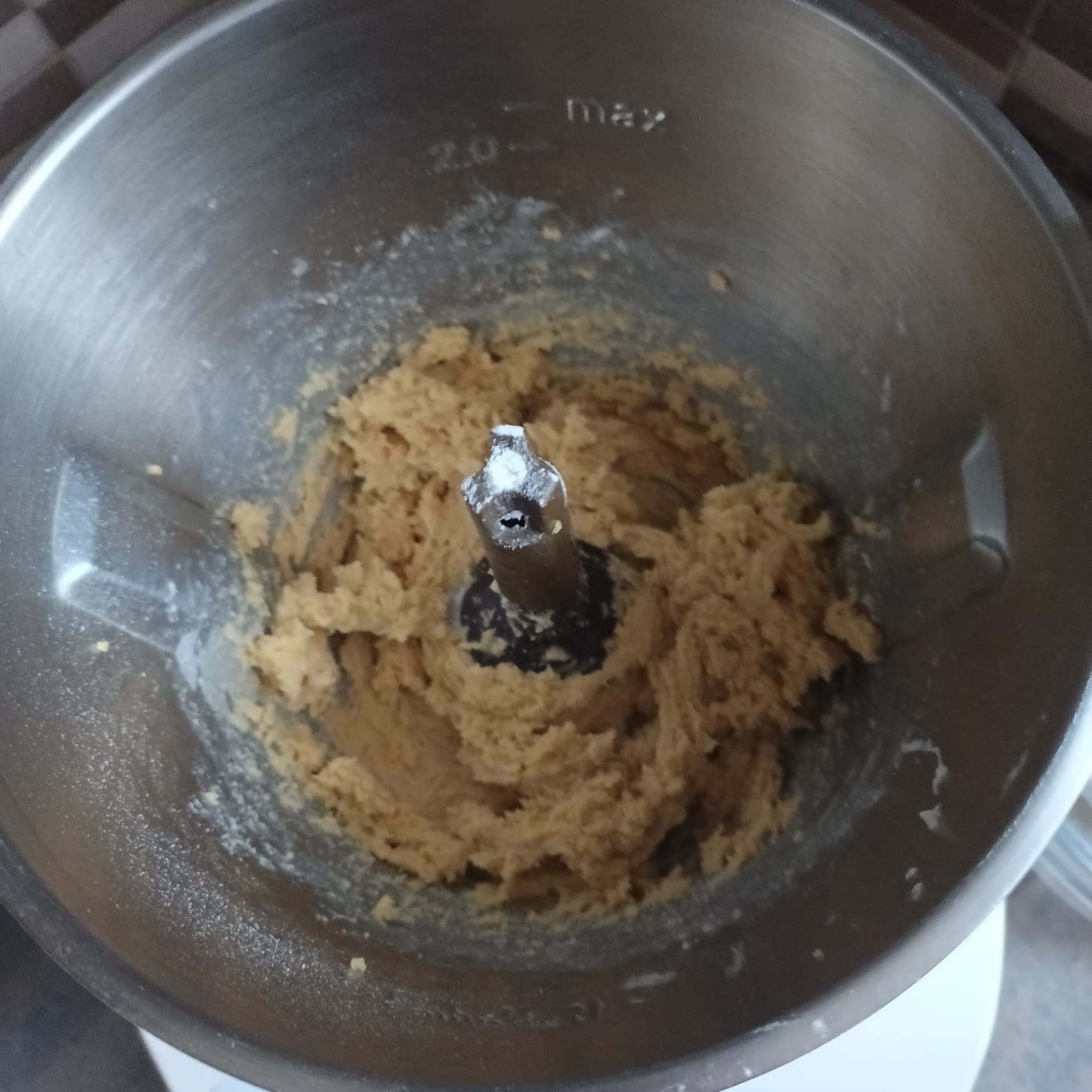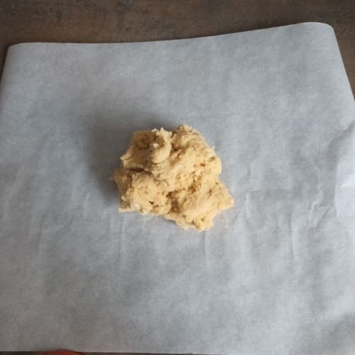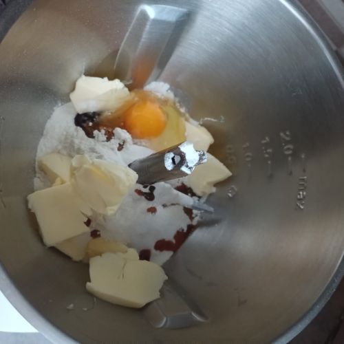 Mélanger 140 de beurre mou + 100 g de sucre + 250 g de farine + 1 oeuf +1 cuillère à soupe de vanille liquide.
