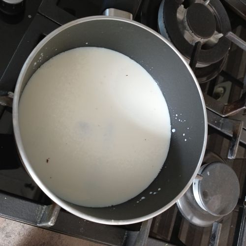 Dans une casserole, faire chauffer 30 cl de lait demi-écrémé + 25 g de sucre + 80 g de chocolat noir.