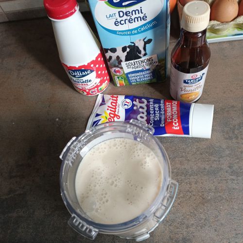 Mélanger 15 cl de lait concentré sucré + 15 cl de crème fleurette à 30 % + 25 cl de lait demi-écrémé + 1 cuillère à soupe de vanille liquide.