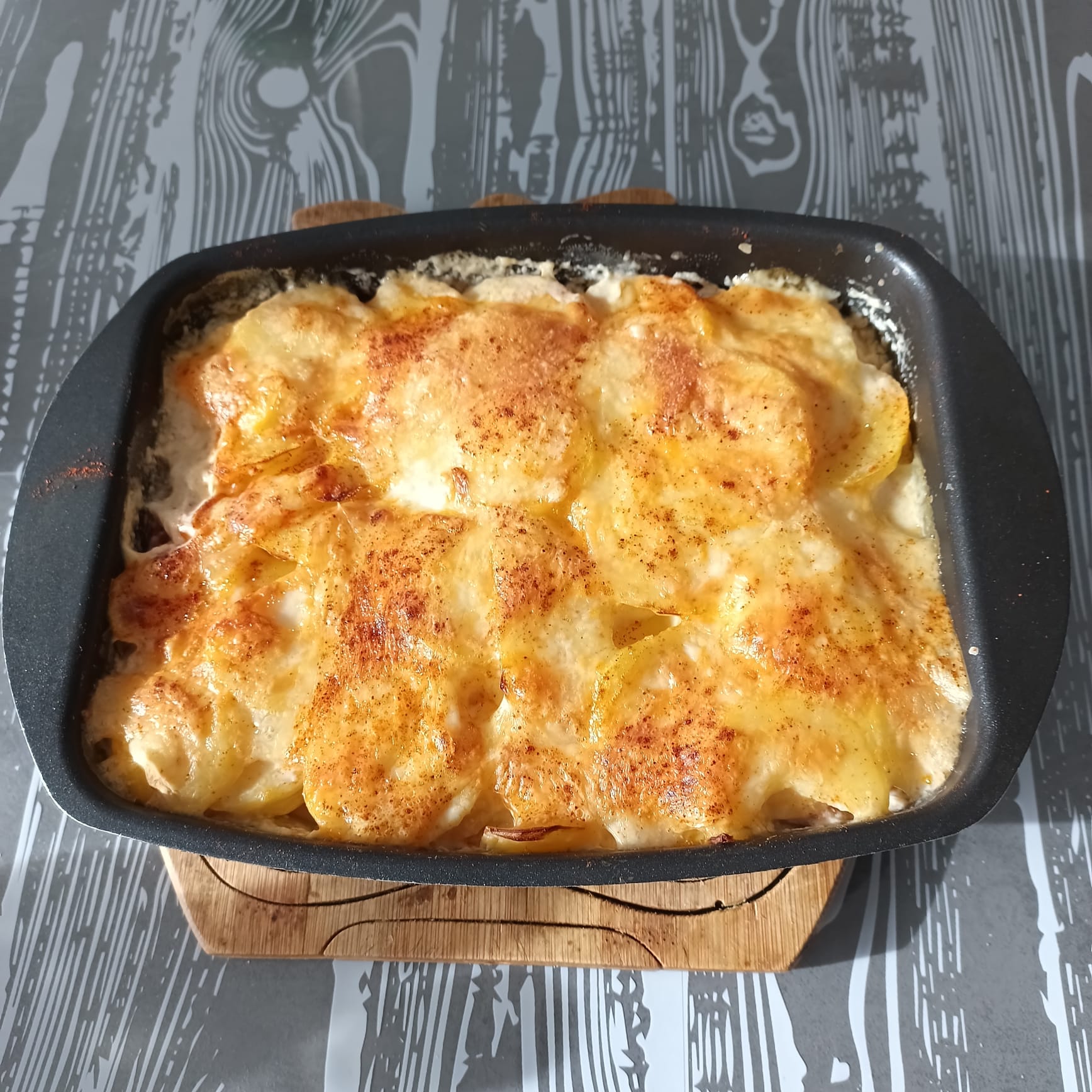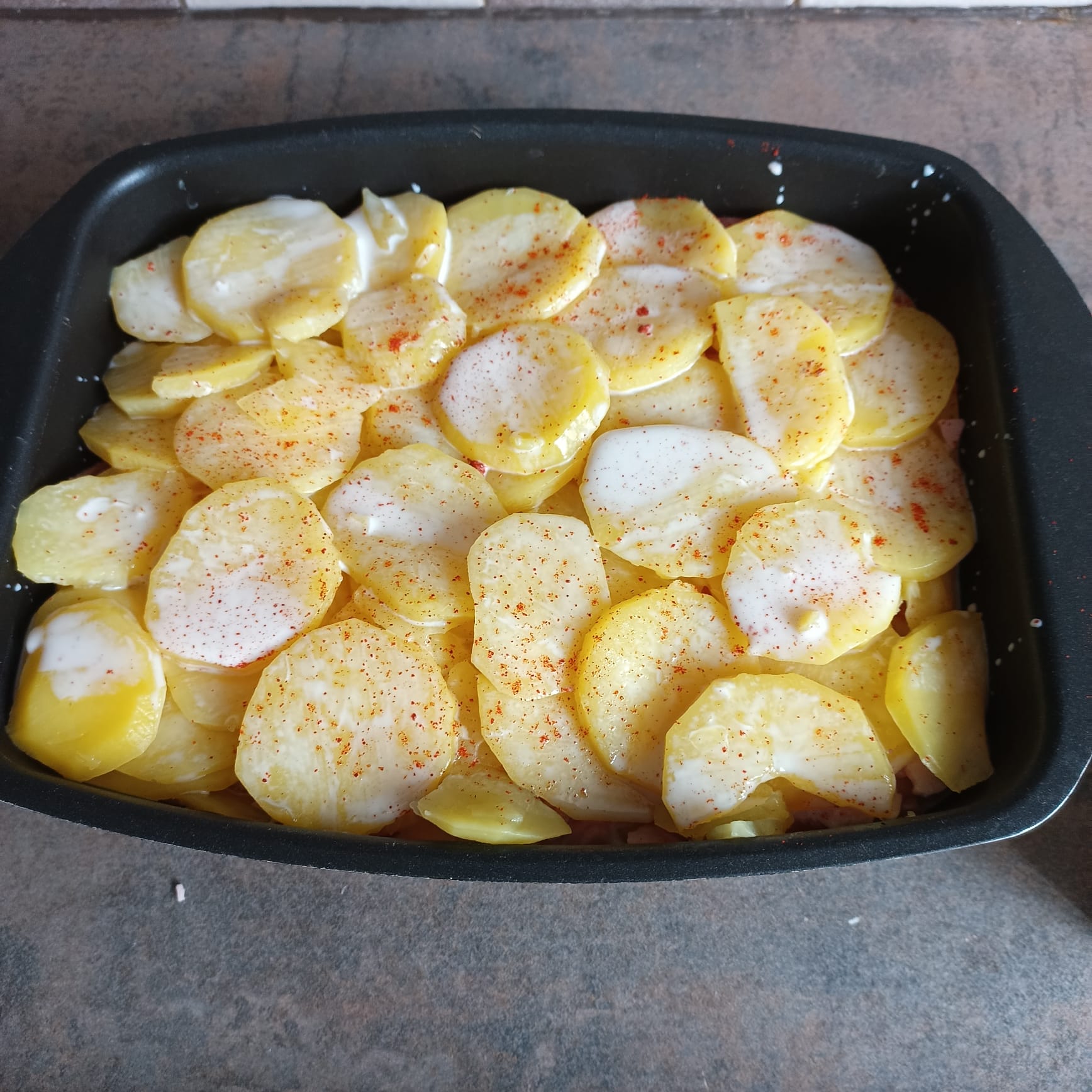 Ajouter 2 autres tranches de jambon coupées en petits morceaux. Ajouter le reste de pommes de terre. Mélanger 20 cl de crème liquide avec 5 cl de lait ; saler, poivrer et ajouter du paprika ; verser cette préparation.