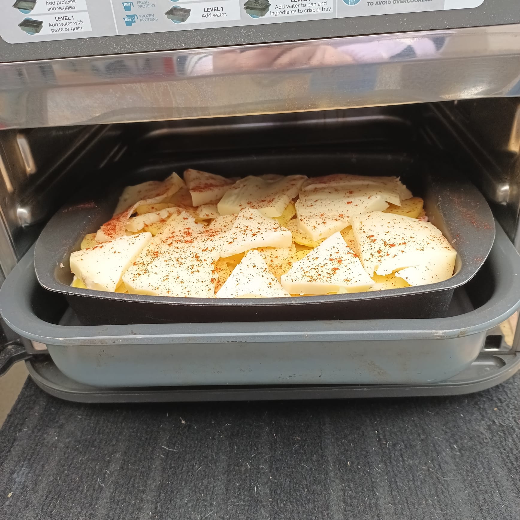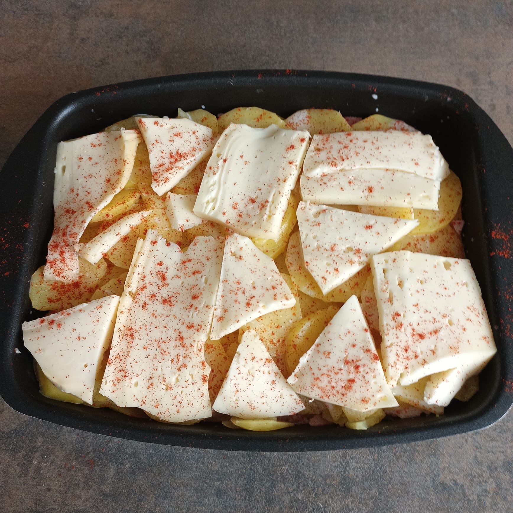 Déposer des tranches de tomme de Savoie sur le dessus et parsemer encore de paprika.