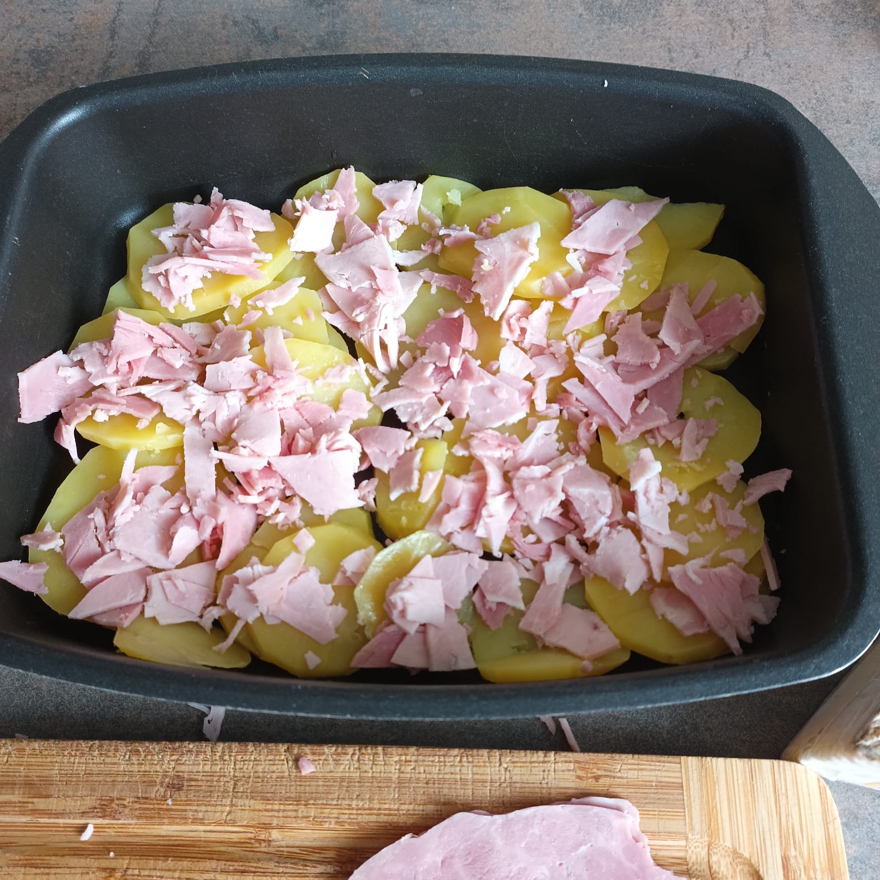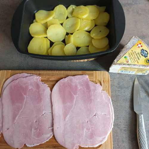 Couper 2 tranches de jambon blanc et déposer les morceaux sur les pommes de terre.