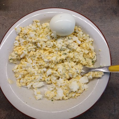 Ecraser à la fourchette 4 oeufs durs ; ajouter un peu de mayonnaise maison.