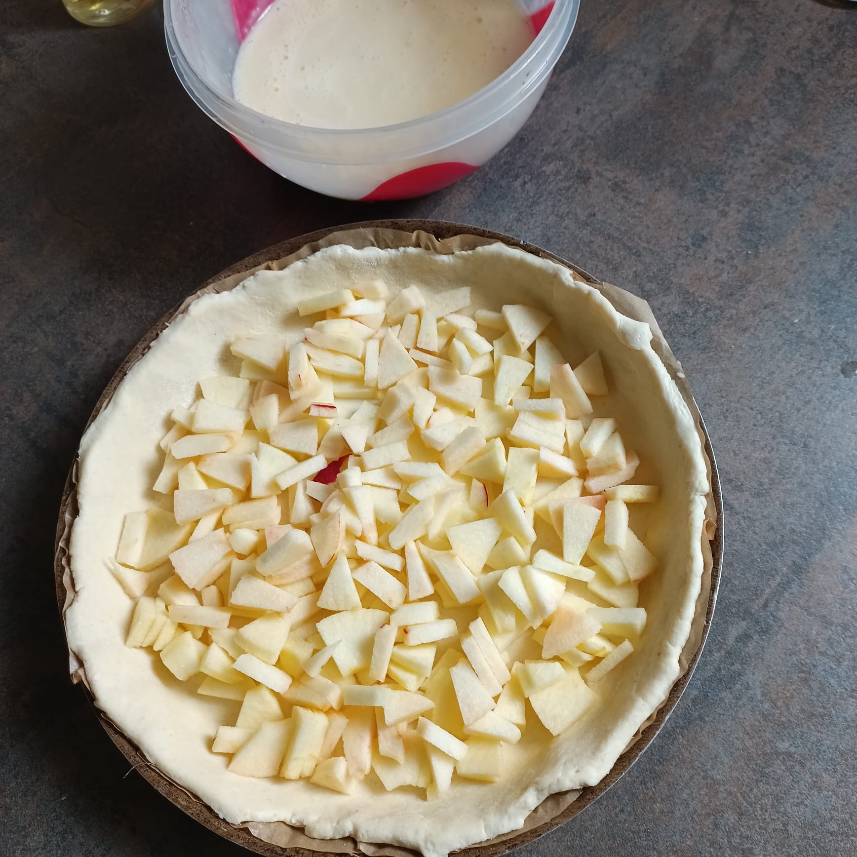 Découper 2 pommes en petits morceaux et les déposer sur la pâte.